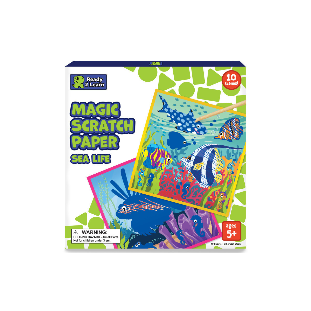 10 SCENES -- This scratch art kit features 10 different activity boards. Use the 2 bamboo scratch sticks to reveal vibrant, underwater scenes!