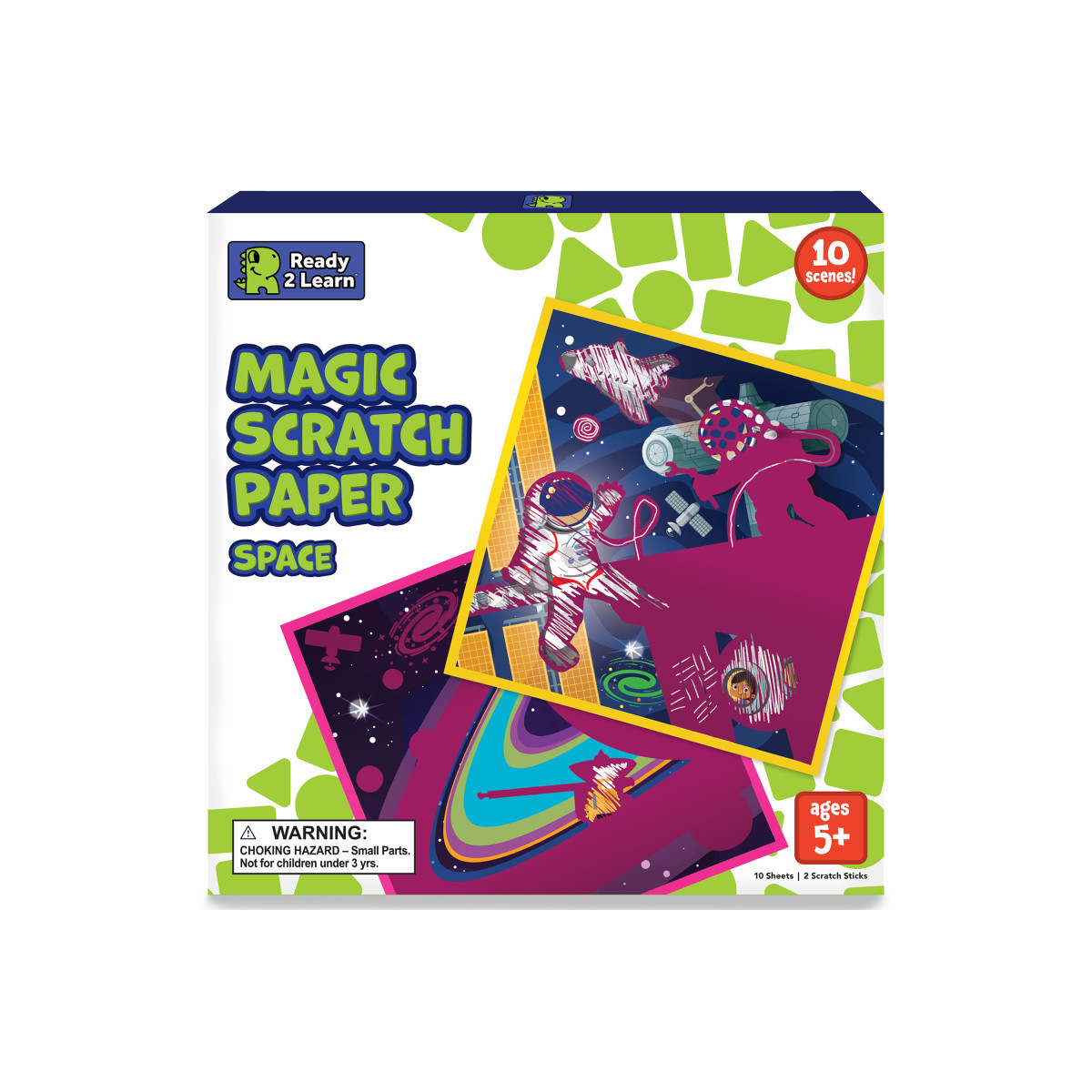 10 SCENES -- This scratch art kit features 10 different activity boards. Use the 2 bamboo scratch sticks to reveal vibrant, outer space scenes!