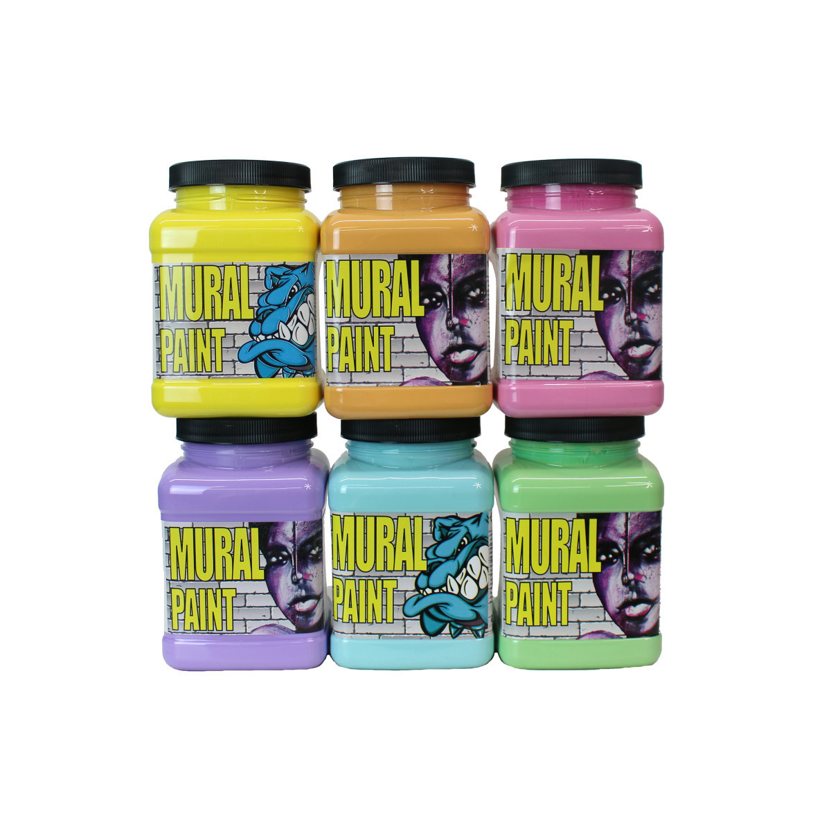 Chroma Mural Paint is specifically designed for outdoor use and street art! Chroma Acrylic Mural Paint is a lightfast, water-resistant, durable, liquid acrylic formula that is water-mixable with a low VOC. The paint is vibrantly pigmented for superior coverage and handling. Hard-wearing and water-resistant, these paints are perfect for use on virtually any surface, indoors or out, and are especially well-suited for mural and urban art. Chroma Mural Paints are non-toxic, water-resistant, and lightfast: perfect for bringing fine art to the streets! Each set includes 6 pints of mural paint in tint colors: Smiley Face, Nacho, POP, Masquerade, Chill, and Mint.