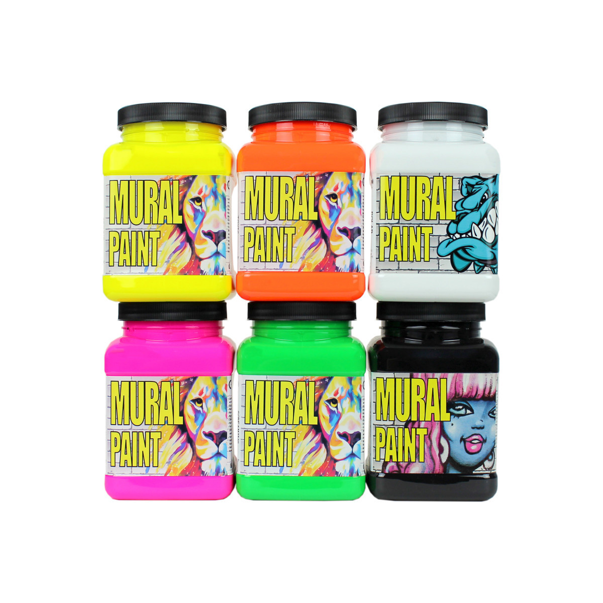 Chroma Mural Paint is specifically designed for outdoor use and street art! Chroma Acrylic Mural Paint is a lightfast, water-resistant, durable, liquid acrylic formula that is water-mixable with a low VOC. The paint is vibrantly pigmented for superior coverage and handling. Hard-wearing and water-resistant, these paints are perfect for use on virtually any surface, indoors or out, and are especially well-suited for mural and urban art. Chroma Mural Paints are non-toxic, water-resistant, and lightfast: perfect for bringing fine art to the streets! Each set includes 6 pints of mural paint neon colors: Screaming Green, Sizzling Pink, Techno Yellow, Polar, and Blacktop.