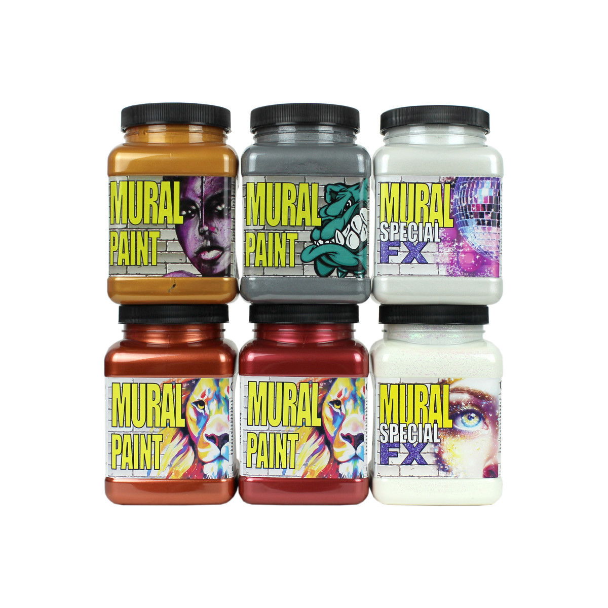 Chroma Mural Paint is specifically designed for outdoor use and street art! Chroma Acrylic Mural Paint is a lightfast, water-resistant, durable, liquid acrylic formula that is water-mixable with a low VOC. The paint is vibrantly pigmented for superior coverage and handling. Hard-wearing and water-resistant, these paints are perfect for use on virtually any surface, indoors or out, and are especially well-suited for mural and urban art. Chroma Mural Paints are non-toxic, water-resistant, and lightfast: perfect for bringing fine art to the streets! Each set includes 6 pints of mural paint in metallic colors: Backstage Pass, Encore, Glam Rock, Rock Star, Disco, and Pixie Dust.