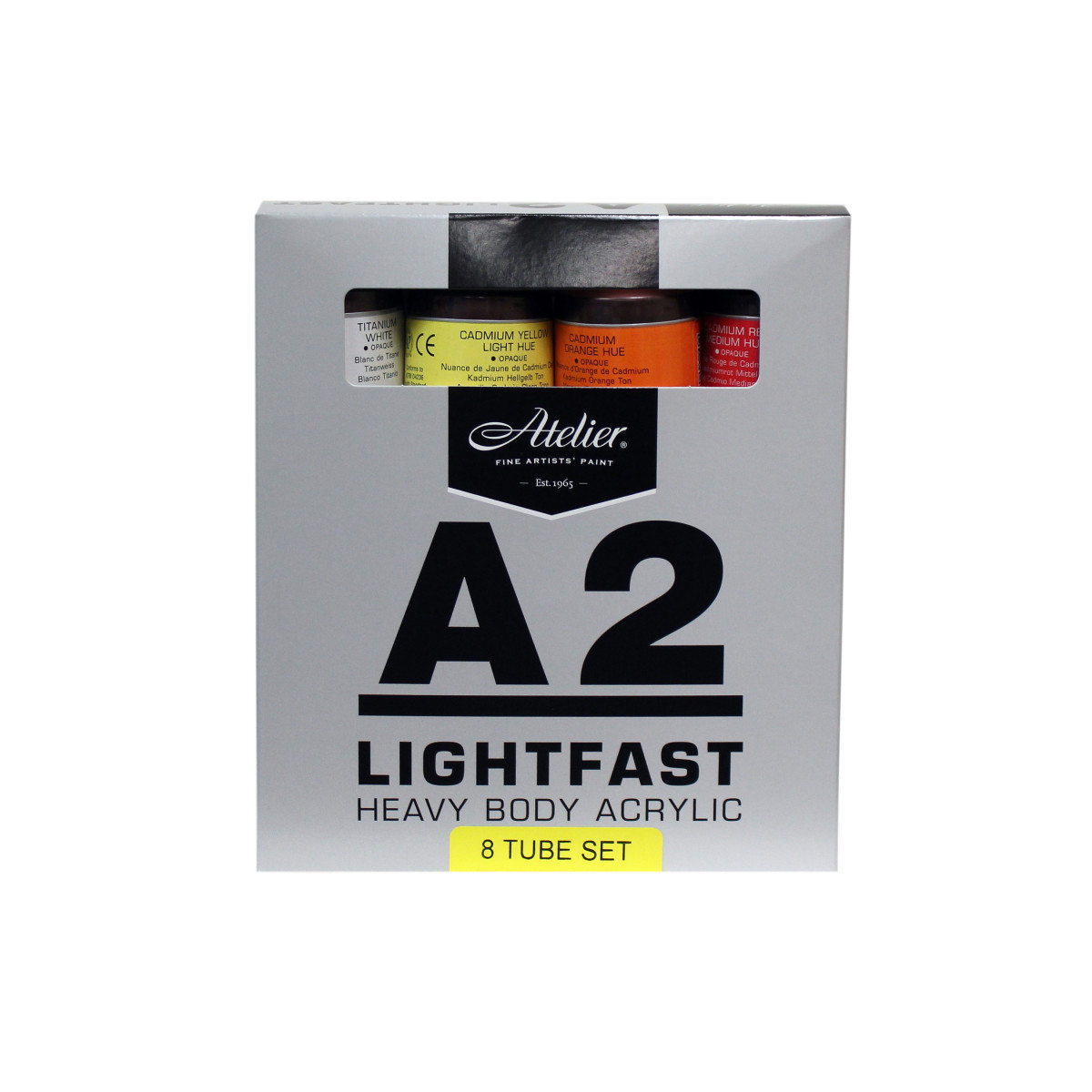 Atelier A2 Lightfast Heavy Body Artists’ Acrylics are a truly outstanding, highly pigmented, lightfast acrylic color made with modern pigments. The result is an acrylic color that has a great thick body with excellent brush-mark retention for acrylic color techniques and a brilliance and clarity as rich as professional acrylic colors. Colors dry to a semi-gloss finish for excellent color saturation and luminosity. Atelier A2 Acrylics offer professionals and beginners alike a great quality artist acrylic. Each set includes (8) 120 ml tubes of A2 Heavy Body Lightfast Artist Acrylic in 8 colors: Titanium White, Cadmium Yellow Light Hue, Cadmium Orange Hue, Cadmium Red Med Hue, Alizarine Crimson Hue, Dioxazine Purple Hue, Pthalo Blue, and Pthalo Green Hue.