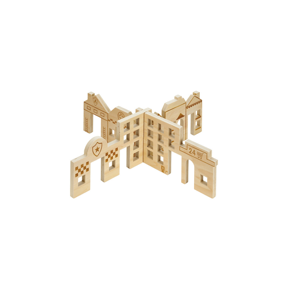 ENCOURAGE COLLABORATIVE PLAY --Town-themed birch plywood dividers simply slot together to create a 4-way imaginative play scene for small group play.