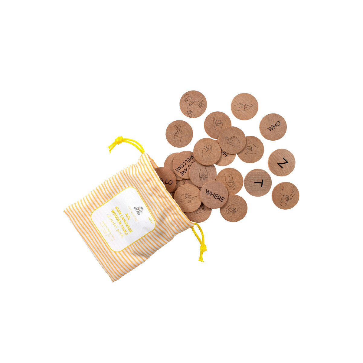 42 SIGN LANGUGE DISKS -- This set includes 42 wooden disks with signs of the alphabet A-Z and commonly used terms like please, thank you, goodbye and more.