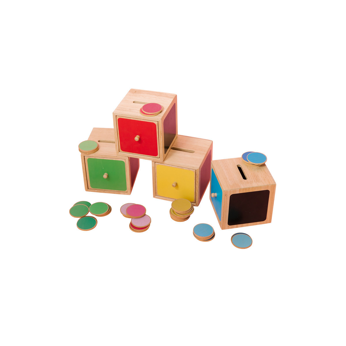 Each sorting box features a different colored door (green, red, blue or yellow). And the disks come in a variety of shades to match. Match the disks to each colored box to practice sorting and counting.