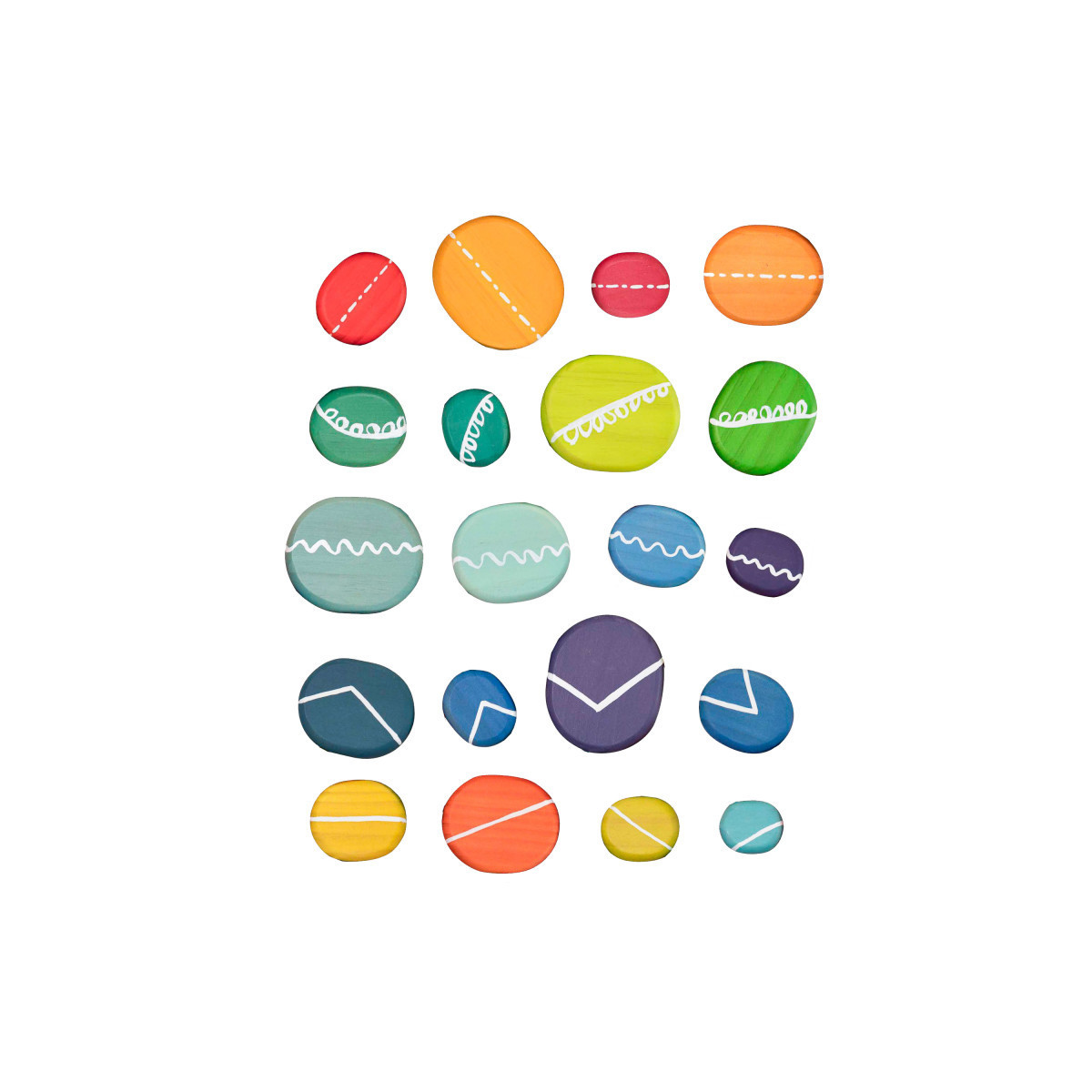 This set includes 20 colorful pebbles with 5 different patterns. Children can use them to count, sort, sequence and stack. These chunky pebbles are ideal for early math activities and loose parts play. And they’re perfect for small hands. Made from durable rubberwood and non-toxic paint, these pebble-shaped pieces are designed for years of use. For ages 1+. Sizes: 1.8"L x 1.6"W x 0.4"H - 3.4"L x 3"W x 0.4"H.
