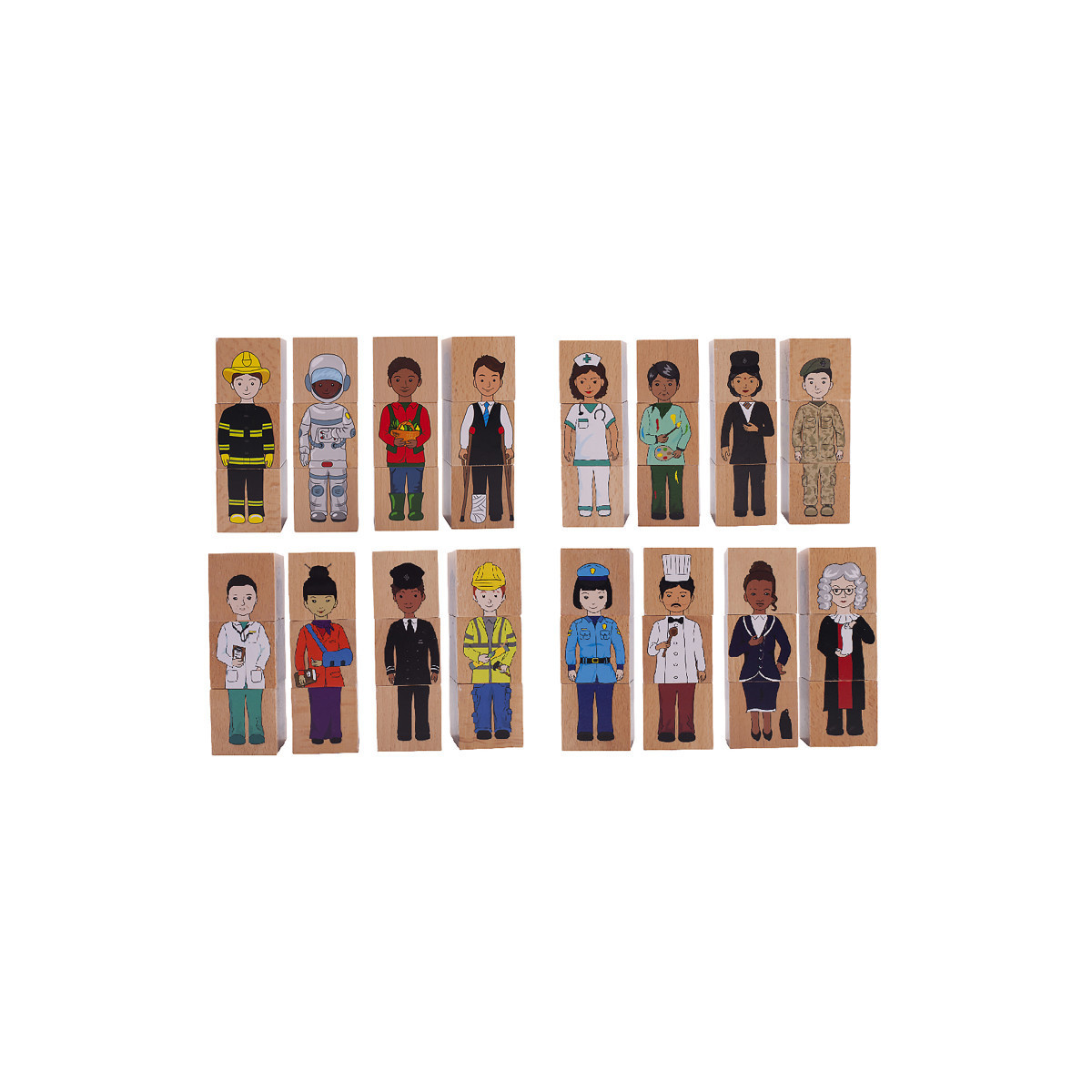 This set includes 12 chunky blocks that illustrate 16 occupations. Each block displays 4 heat-transferred images for children to mix and match. These blocks include people from different genders and backgrounds. Open up discussions about diversity and the community. These blocks are made from durable beechwood. They are designed to last for years of classroom or home use. For ages 1+. Size: 2" cube.
