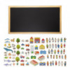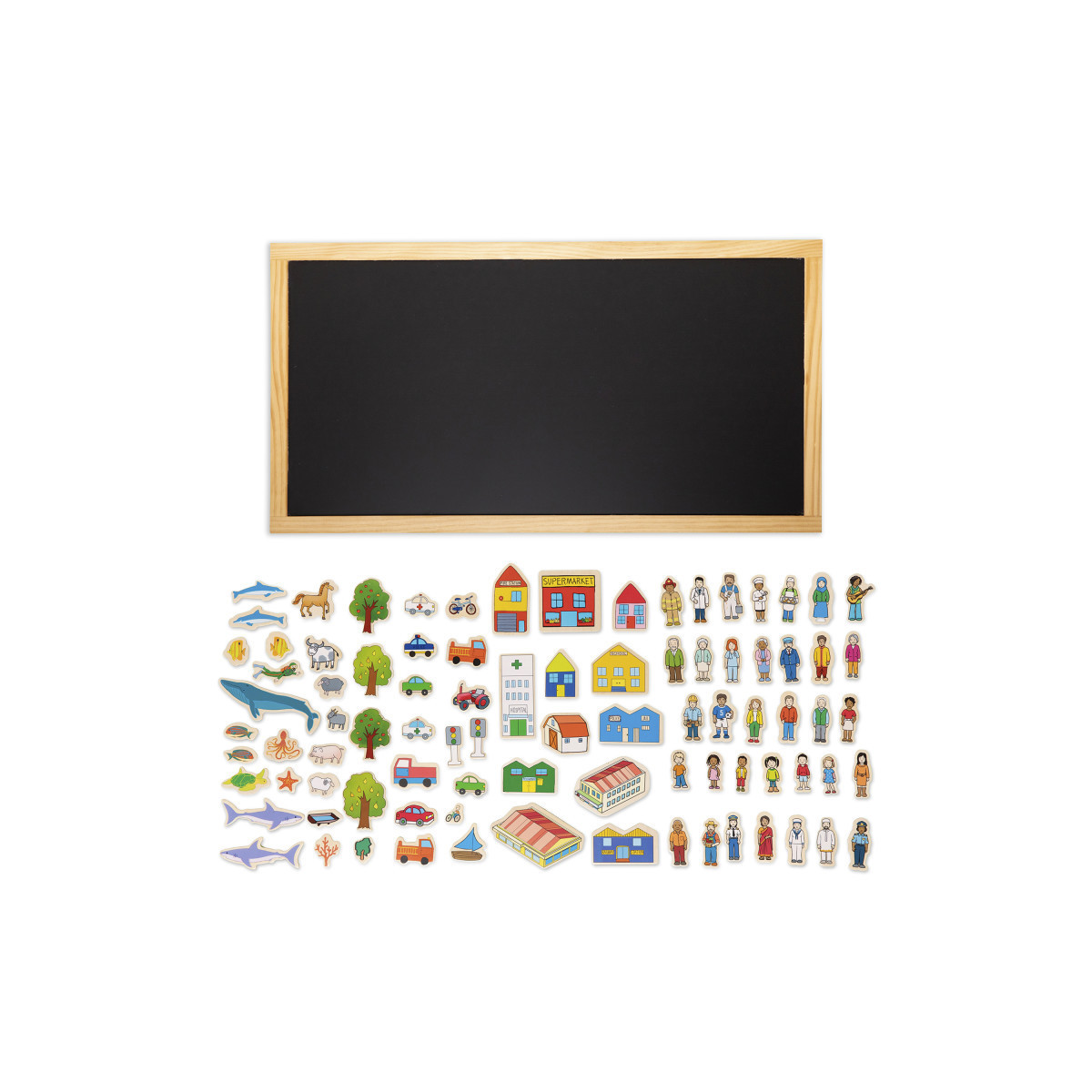 This large magnetic chalkboard features 75 thick wooden magnets. Create town-themed scenes and tell stories with an assortment of animals, trees, vehicles, buildings and people. This set includes people from different ages, genders and ethnic backgrounds. Open up conversations about diversity, inclusion and roles in the community. The illustrations are heat transferred onto each wooden magnet. These chunky magnets are perfect for small hands. The board features a pinewood frame. And the magnets are made from durable wood to last for years of use. For ages 3+. Size of board: 17.7"L x 33.5"W. Size of smallest magnet: 1.25"L x 1"W.
