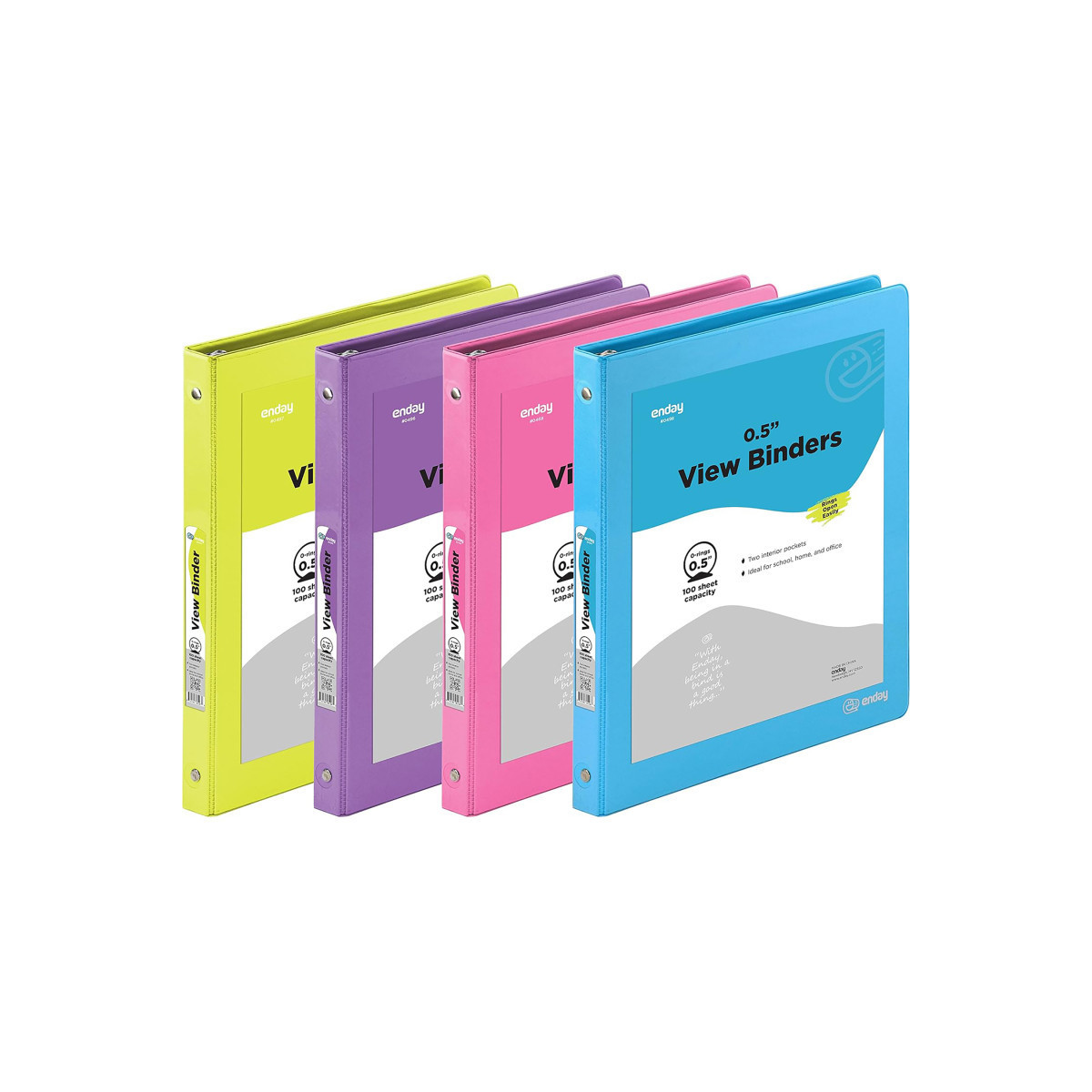 The customizable 0.5-inch 3-ring binder is the perfect organizational tool for home, school, or office use. Sold as a 4-pack in assorted colors, these binders are ideal for color-coding by subject or project, making them both kid-friendly and professional. Lightweight and compact, they are designed for efficient storage while offering a tear-resistant cover to ensure durability and a like-new appearance over time. The transparent, non-stick overlay on the front, spine, and back cover allows for easy customization, making it simple to label and identify even when stored on a crowded shelf.