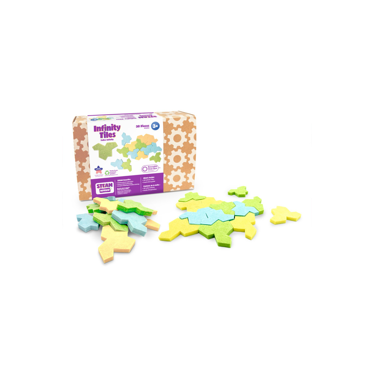 Have you heard about these aperiodic tiles? This 13-sided tile shape is designed based on the math concept of aperiodicity, meaning that the pattern will never ever repeat itself. This makes it a fun, brain-building puzzle for children and adults. Arrange the tiles in unlimited ways to create unique designs and engage your creativity skills. Use this hands-on activity as a gateway to other mathematical concepts or simply relax and play puzzle games. The tiles are made with a recycled PET felt to ensure future generations are able to puzzle and discover too. The set also comes with guide that suggests a few ideas to get you started. Includes 30 Einstein Tiles and play guide with ideas.