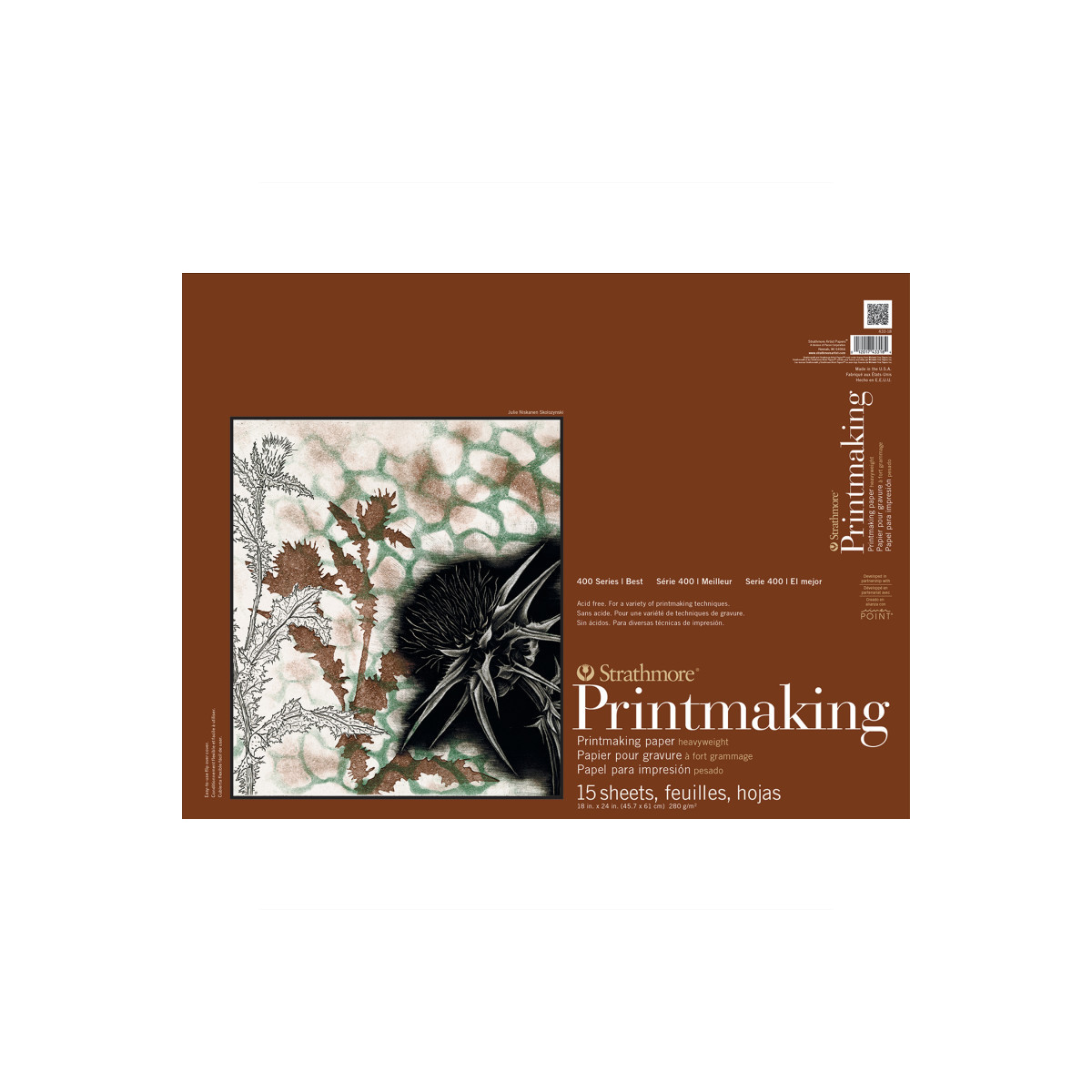 Introducing Strathmore 400 Series Heavyweight Printmaking Paper-- a natural white paper made for relief printing with block or linocut, screen printing, lithography, intaglio, practicing, and proofing. This paper utilizes medium-textured surface that is both soft and durable to absorb large amounts of ink. Contains high levels of alpha cellulose wood fiber to improve absorption while making your images pop. Our 400 Series is often easily recognized thanks to the iconic brown cover used across our fine art pads.