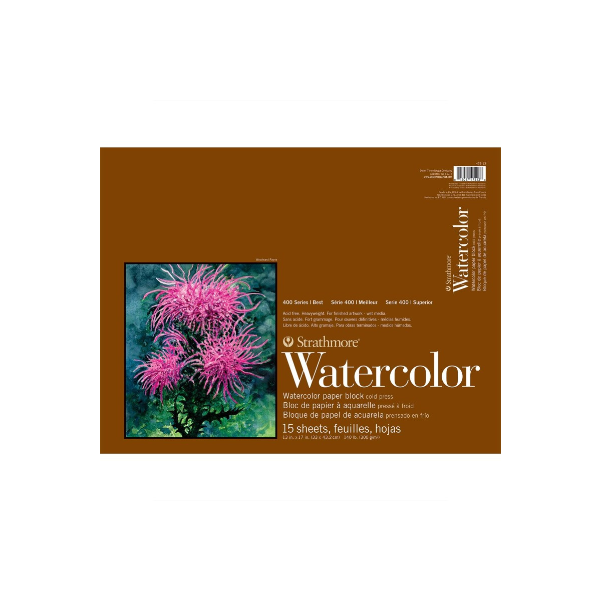 Introducing Strathmore 400 Series Watercolor Paper—a cold press sheet offering just the right amount of texture to bring depth & character to every brushstroke. Its absorbent surface beautifully captures vibrant colors while allowing for smooth blends & soft transitions, making your watercolors come to life. This versatile paper is perfect for everything from delicate washes to bold, expressive techniques, perfect for professional watercolor artists. What makes a Watercolor Block different from a Watercolor Pad? The paper is bound on all 4 sides, keeping it flat while the artist works without the need for taping edges down. Our 400 Series is often easily recognized thanks to the iconic brown cover used across our fine art pads. Known for its dependable quality & time-tested durability, this series is a staple in the hands of art students & professional artists, from their first art class in middle school, through to high school competitions, collegiate course work & on to a career as a professional artist, fashion designer, architect, illustrator, animator or engineer. Artists working with watercolor paint, acrylic paint, oil paint, pastel, colored pencil, charcoal, marker, pen, ink & more have a curated paper customized for their needs. Confidently create showcase-worthy pieces for galleries, competitions & online market places with this beloved series!