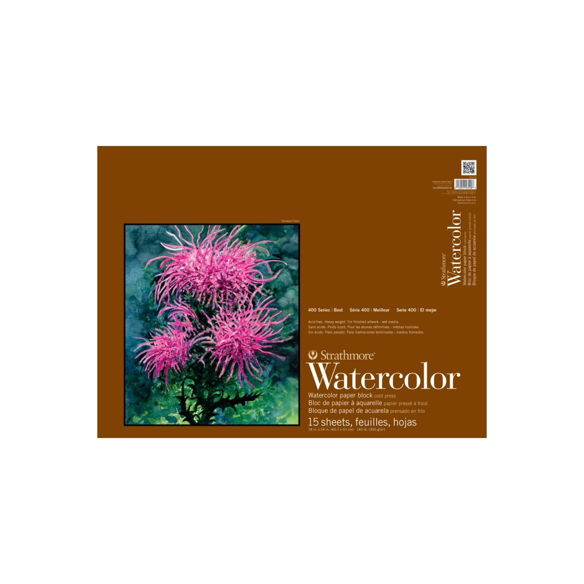 Introducing Strathmore 400 Series Watercolor Paper—a cold press sheet offering just the right amount of texture to bring depth & character to every brushstroke. Its absorbent surface beautifully captures vibrant colors while allowing for smooth blends & soft transitions, making your watercolors come to life. This versatile paper is perfect for everything from delicate washes to bold, expressive techniques, perfect for professional watercolor artists. What makes a Watercolor Block different from a Watercolor Pad? The paper is bound on all 4 sides, keeping it flat while the artist works without the need for taping edges down. Our 400 Series is often easily recognized thanks to the iconic brown cover used across our fine art pads. Known for its dependable quality & time-tested durability, this series is a staple in the hands of art students & professional artists, from their first art class in middle school, through to high school competitions, collegiate course work & on to a career as a professional artist, fashion designer, architect, illustrator, animator or engineer. Artists working with watercolor paint, acrylic paint, oil paint, pastel, colored pencil, charcoal, marker, pen, ink & more have a curated paper customized for their needs. Confidently create showcase-worthy pieces for galleries, competitions & online market places with this beloved series!