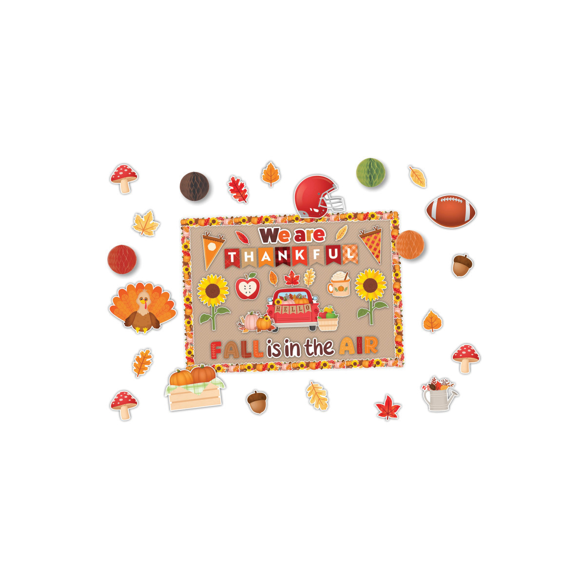 Create a fun and festive atmosphere with this all-in-one decorating kit! With an easy-to-assemble setup, you can focus on making lasting memories without the hassle. Plus, you can add your own creative spin to customize the look and make it truly unique to your style. Includes 105 pieces: 10 pieces spelling out “Fall is in the Air”, 10 pieces spelling out “We are Thankful”, 1 truck centerpiece, 2 sunflowers (12.8" tall), 54 accents in assorted sizes ranging from 1.3" to 12.8", 4 hanging paper honeycomb balls; each measure 6" in diameter, and 24 borders; each measure 12.5" x 2.2" for a total of 25 feet.
