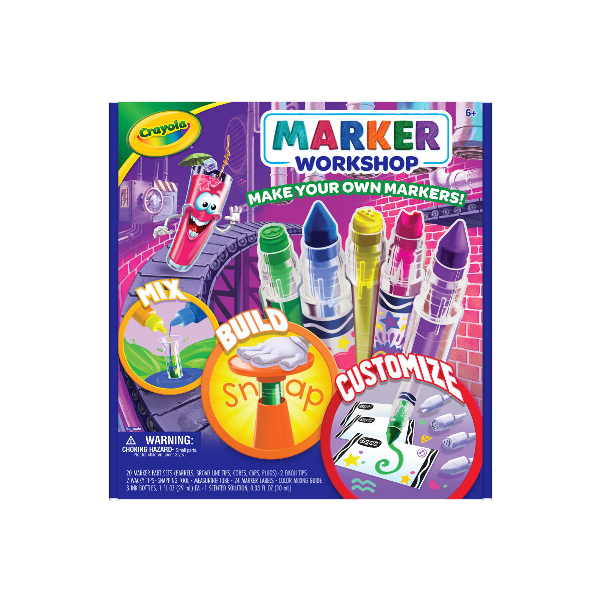 CRAYOLA MARKER WORKSHOP: Dive into creativity and build 20 Crayola Markers using the included Marker Assembler, 1 Measuring Vial, 3 Vibrant Ink Bottles, 1 Fruity Scented Ink Bottle (Fruit Punch), 24 Marker Labels, 2 Wacky Nibs, and 2 Emoji Nibs.