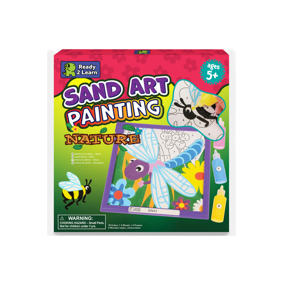 - SAND NEVER LOOKED SO GRAND -- This sand craft features four designs and 10 vibrant colors. Use the bottles to sprinkle and pour. Color birds, ladybugs, bees and more!