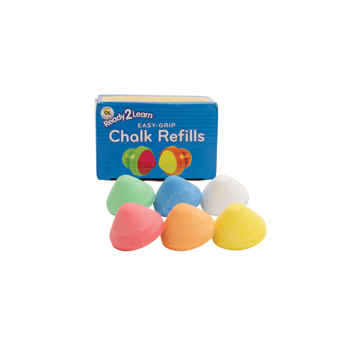 This set includes 6 refills for Easy Grip Chalk (CE6914) in red, green, yellow, blue, orange and white. Easy Grip Chalk pieces feature ball-shaped, easy grip plastic handles and nest comfortably in small hands. Perfect for toddlers and special needs children, this chalk provides greater fine motor control as children create colorful content. With 6 bright colors and an ergonomic design, Easy Grip Chalk also fosters independence and inspires creative expression. No more worrying about snapping chalk pieces! The handles are made of thick plastic for extra durability. These chalk refills easily screw into the Easy Grip handles. Includes instructions. For ages 18m+. Size of refills: 1.6" dia.