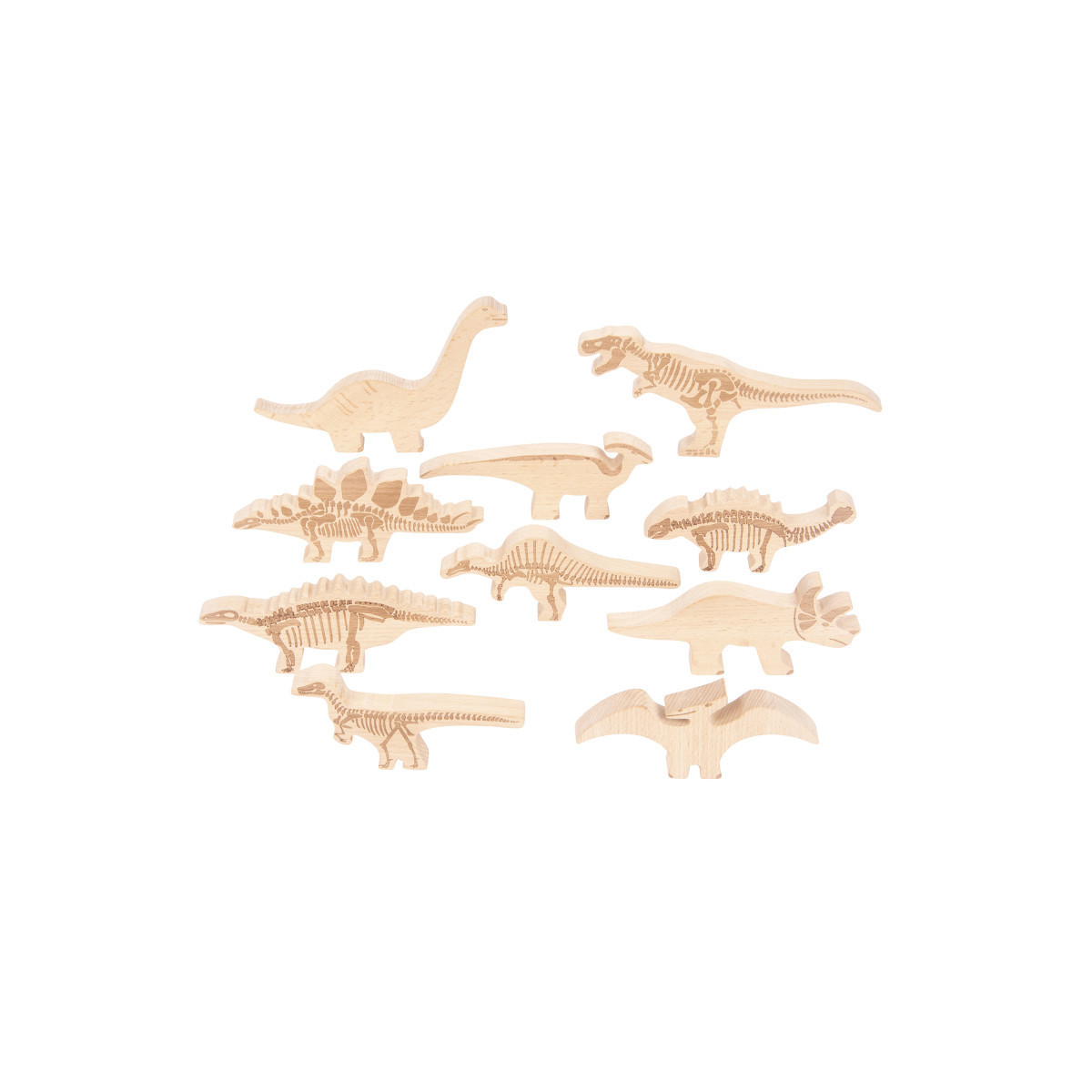 This set includes 10 wooden dinosaur blocks. Each block illustrates features on one side and a skeleton on the other. Explore the laser-indented markings for added tactile stimulation. Stamp the blocks into dough. The blocks are perfect for young children to learn about dinosaurs, engage in imaginative play and develop their descriptive language skills. Or, use them in lessons about the Prehistoric Era. This set is great for individual or group play. Made from durable beechwood, this set is designed to last for years. These thick blocks stand on their own. And they’re perfect for small hands to grasp. For ages 10m+. Sizes: 6.5"L x 0.6"W x 4.4"H - 4.75"L x 0.6"W x 2.25"H.