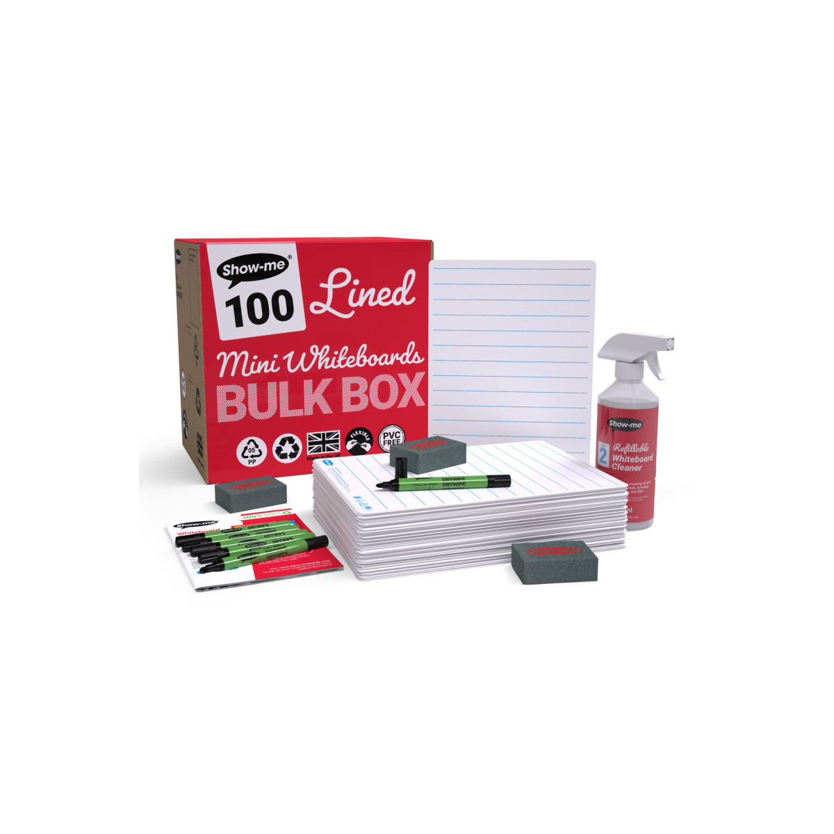 Each Show-me board comes complete with a marker and a mini foam eraser, making it a convenient all-in-one tool for classroom use. Every box also includes a free board cleaner and a helpful guide to help you get the most out of your dry erase lapboards. The packaging is entirely plastic-free and fully recyclable, reflecting a strong commitment to sustainability. Bulk Box of 8.27" x 11.69" Lined/Plain dry erase lapboards contains 100 sets.