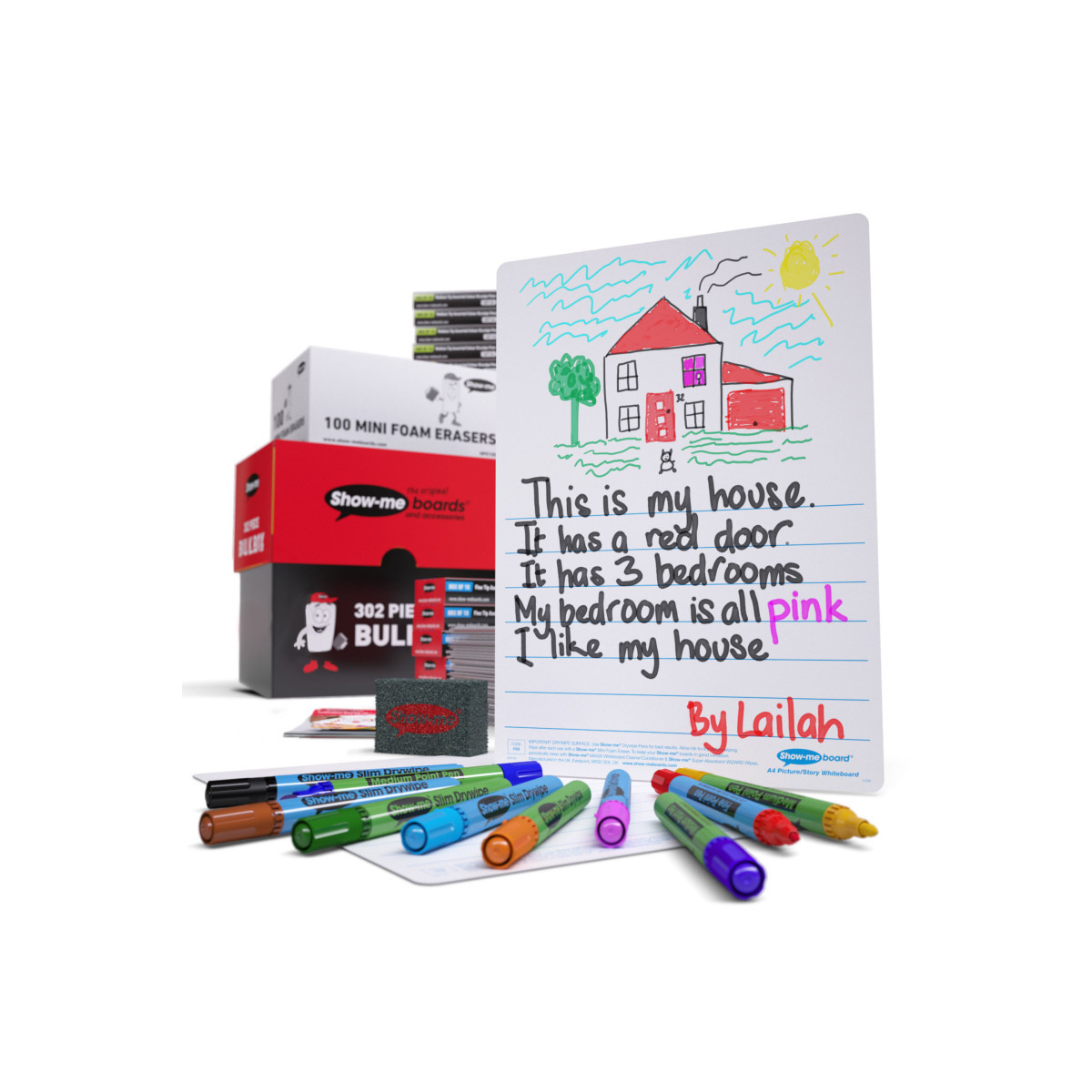 Each Show-me board comes complete with a marker and a mini foam eraser, making it a convenient all-in-one tool for classroom use. Every box also includes a free board cleaner and a helpful guide to help you get the most out of your dry erase lapboards. The packaging is entirely plastic-free and fully recyclable, reflecting a strong commitment to sustainability. Bulk Box of 8.27" x 11.69" Picture Story dry erase lapboards contains 100 sets.