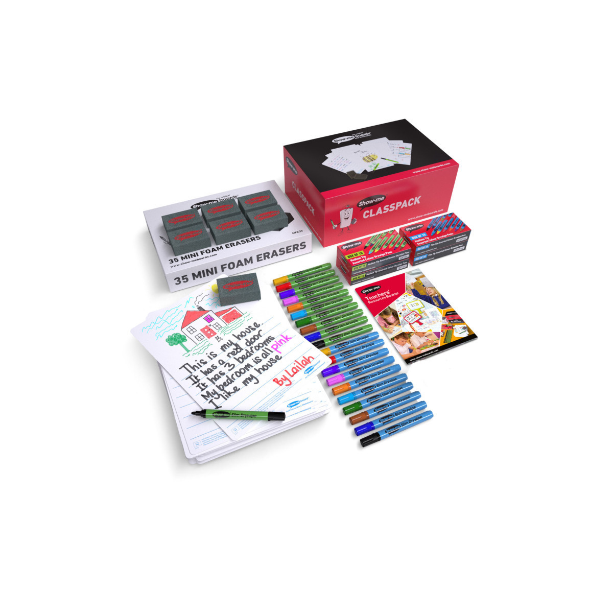 Included in this pack are Show-me student markers, specifically designed for young learners. They feature a slim barrel that fits comfortably in small hands, an easy-fit lid, and an extra-hard nib that resists splaying. A built-in nib-stop prevents the tip from being pushed into the barrel, enhancing durability. The mini foam erasers are soft and gentle to protect both the boards and young users, while being lightweight and perfectly sized for small hands.
