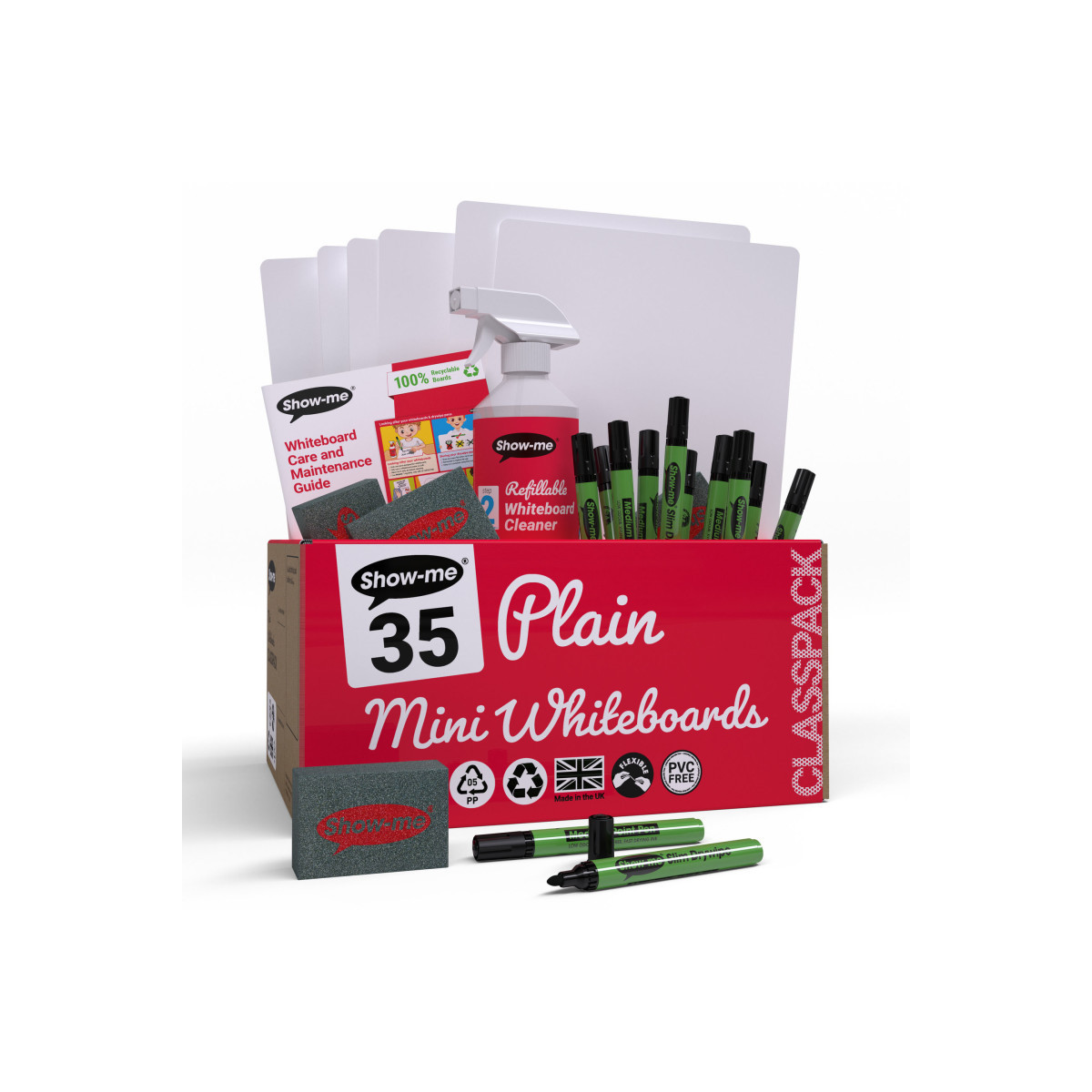 Each Show-me board comes complete with a marker and a mini foam eraser, making it a convenient all-in-one tool for classroom use. Every box also includes a free board cleaner and a helpful guide to help you get the most out of your dry erase lapboards. The packaging is entirely plastic-free and fully recyclable, reflecting a strong commitment to sustainability. Classpack of 8.27" x 11.69" Plain/Plain Dry Erase Lap Boards contains 35 sets.