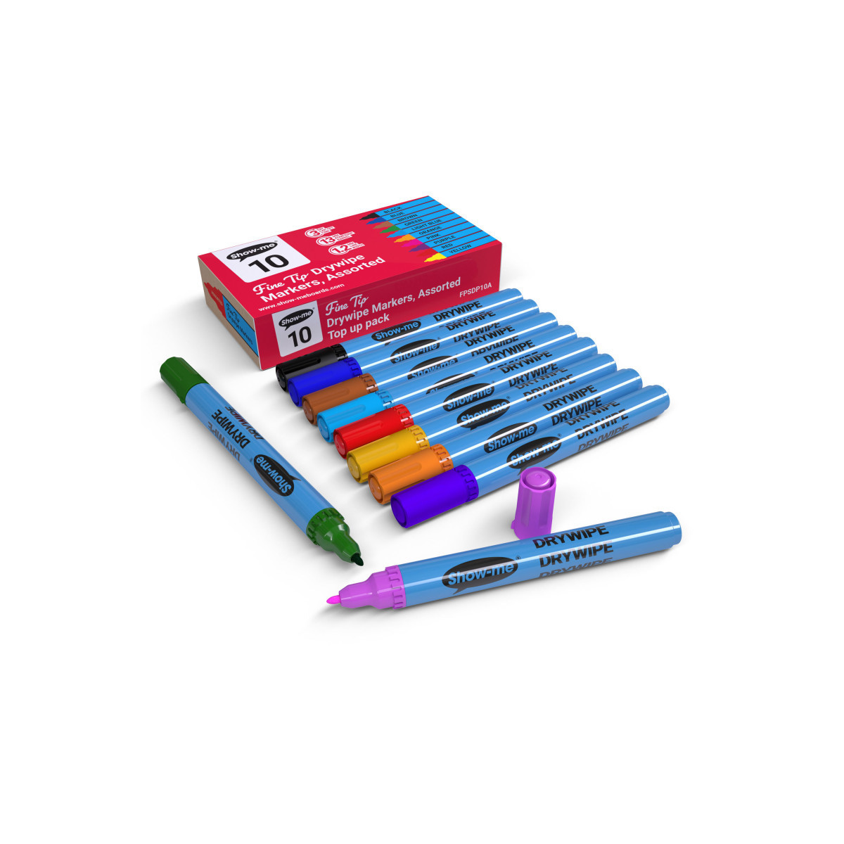 Show-me dry erase markers are expertly designed for educational use and are trusted by thousands of schools around the world. Engineered with safety, durability, and classroom practicality in mind, these markers feature a Komfigrip slim barrel that fits comfortably in small hands—perfect for young learners. Each marker includes an extra-hard nib that resists splaying, along with a clever nib-stop that prevents the tip from being pushed into the barrel. The low odor, xylene-free ink makes them ideal for prolonged classroom use, while safety airflow caps help reduce risk if accidentally swallowed. With a 72-hour cap-off time, they won’t dry out easily—keeping up with the pace of busy school days. Suitable for all subjects and age groups, these markers are a must-have for any learning environment. This pack contains 10 fine tip dry erase markers in assorted colors.