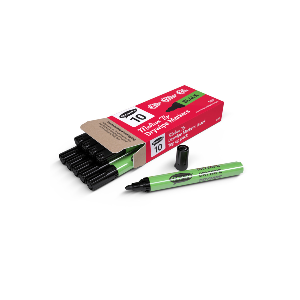 Show-me dry erase markers are purpose-built for the classroom and trusted by thousands of schools worldwide. Designed with young learners in mind, each marker features a Komfigrip slim barrel that fits comfortably in small hands, making them ideal for frequent use in busy educational environments. The extra-hard nib resists splaying, while a clever nib-stop prevents the tip from being pushed into the barrel, ensuring long-lasting performance. Safety is a top priority—these markers use low-odor, xylene-free ink and are equipped with airflow caps to reduce risk if accidentally swallowed. With a 72-hour cap-off time, they resist drying out even if left uncapped. This pack contains 10 medium tip black dry erase markers, combining durability, safety, and functionality in every stroke.