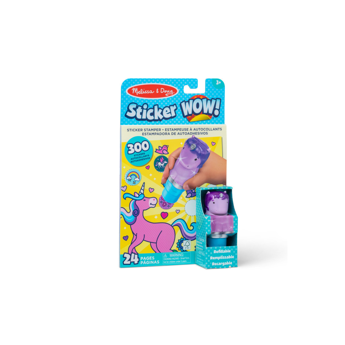 Melissa & Doug Sticker WOW!™ is a whole new way to play with stickers! Let the adorable, collectible Sprinkles the Purple Unicorn stamp, stamp, stamp its way through 24 pages of fun-filled, fantasy-themed counting, matching, and search-and-find activities. The refillable sticker stamper comes pre-loaded with a sticker stack of 300 assorted stickers – with 100 unique designs in every stack, each sticker is a surprise! Themed refill packs are sold separately and are compatible with any Sticker WOW!™ sticker stamper. Stickers are not reusable, but are easy to remove if necessary. Fill in the activity pages and use for creative art projects, such as bookmarks, posters, cards, and more. Easy-to-remove stickers and the convenient on-the-go format with built-in sticker stamper storage makes Sticker WOW!™ a great mess-free travel activity. Sticker WOW!™ (patent pending) promotes fine motor skills, encourages creative play, and it's satisfying, fidget fun! This product is certified by the Forest Stewardship Council. FSC certification ensures that products come from responsibly managed forests that provide environmental, social, and economic benefits, and that forests are protected for future generations. Please note that FSC certification applies to new inventory only (FSC C156584).