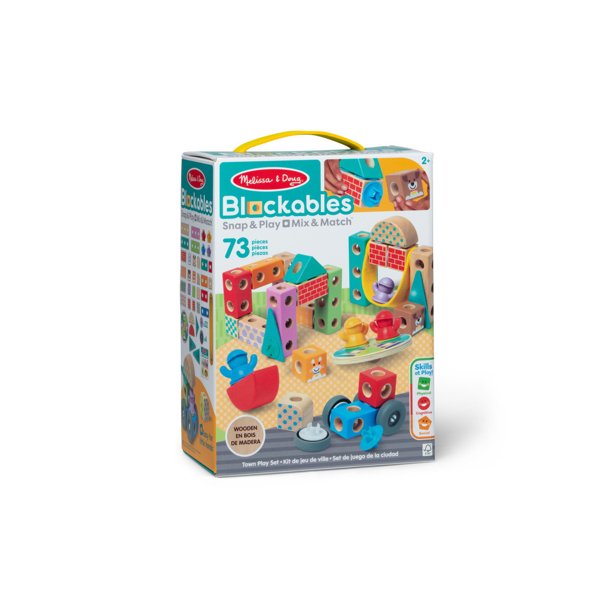 Melissa & Doug Blockables™ are connectable, stackable, and playable! The solid wood connect-and-play building blocks are perfect manipulatives to help preschoolers two and older boost developmental skills (fine motor, problem-solving, matching, storytelling, and self-esteem), while using their imaginations and having fun. Easy-to-grasp smooth, colorful wooden blocks fit together in a snap with large connectors that even little hands can push in and pull out. An illustrated guide shows how to arrange and link the Blockables™ to create a multi-textured neighborhood playground (swing, rocker, carousel, vehicle, pets, buildings, and more), or kids can use their imaginations to mix, match, and combine pieces to make unique creations and play their own way! Kids can easily expand their collection -- the 73-piece Town Play Set is compatible with all other Blockables™ play sets. The packaging folds out to convert into a fun play space and pieces store in the sturdy corrugated box with a soft handle for easy cleanup and portability. Patent pending.