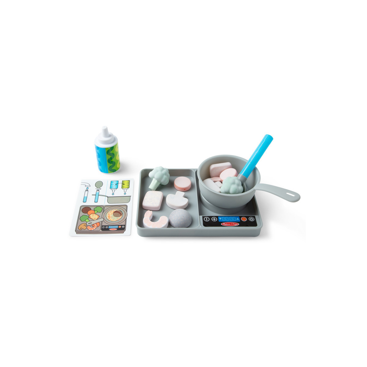 - Includes durable stovetop, water-dispensing spoon and squeeze bottle, cooking pot, 6 color-changing vegetables, 6 color-changing proteins, 2 color-changing meal disks, and double-sided reusable activity card