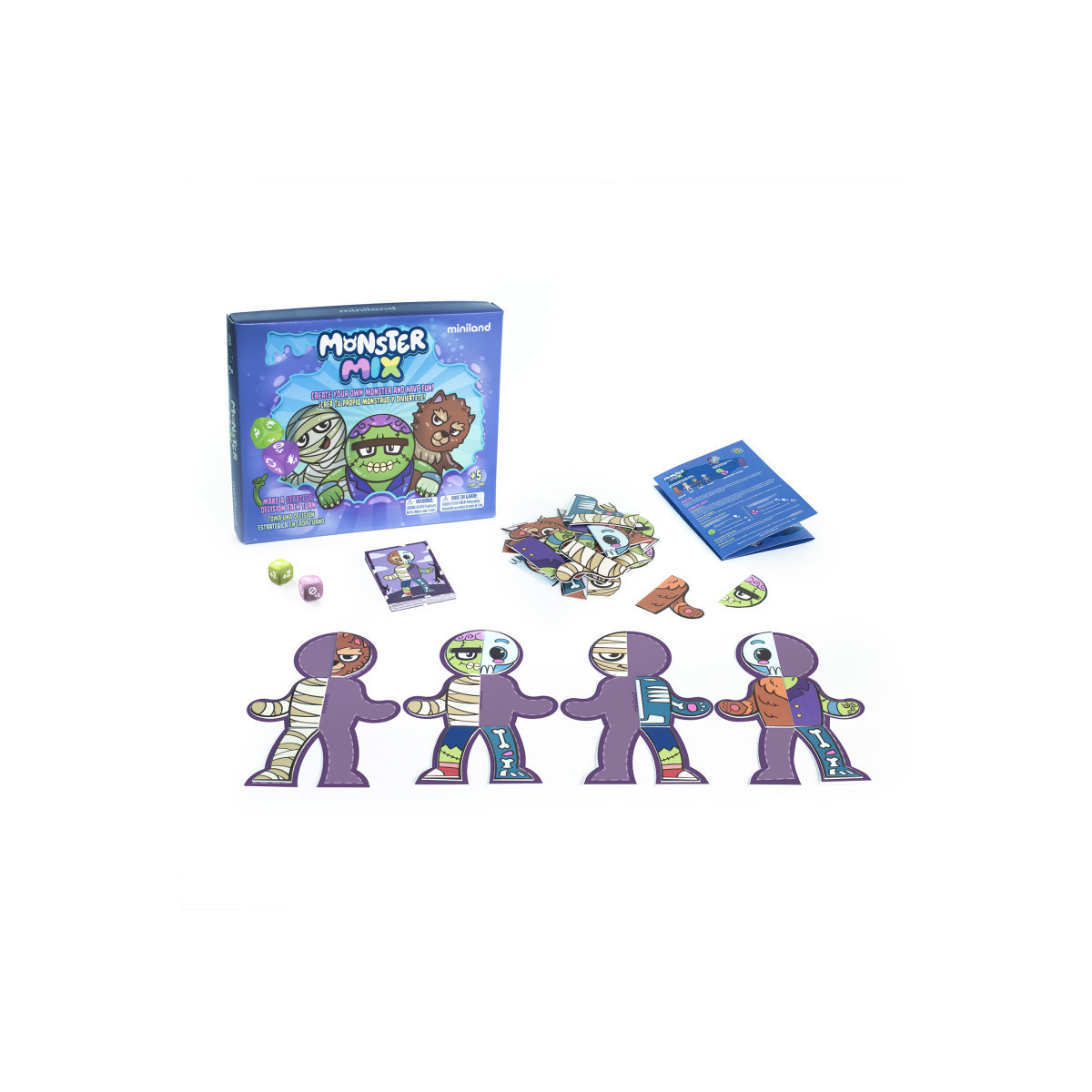 Monster Mix is a board game full of creativity and fun where little ones can build their own zombies while developing important skills. With challenge cards and 48 pieces of body parts, each turn offers an exciting decision: use the green die to take pieces from the center or the red to get them from other players. Bony, hairy, snotty or tentacled, the goal is to be the first to complete your creation! This board game for children ages 5 and up not only entertains, but also helps children understand concepts such as symmetry and left and right directions in a playful way. In addition, it is made with materials from sustainable forests, promoting care for the environment. Contents: 4 body bases, 48 body part pieces, 20 challenge cards, 2 dice and an instruction book. Recommended for ages 5 and up, it is perfect to enjoy with family or friends, combining learning and fun.