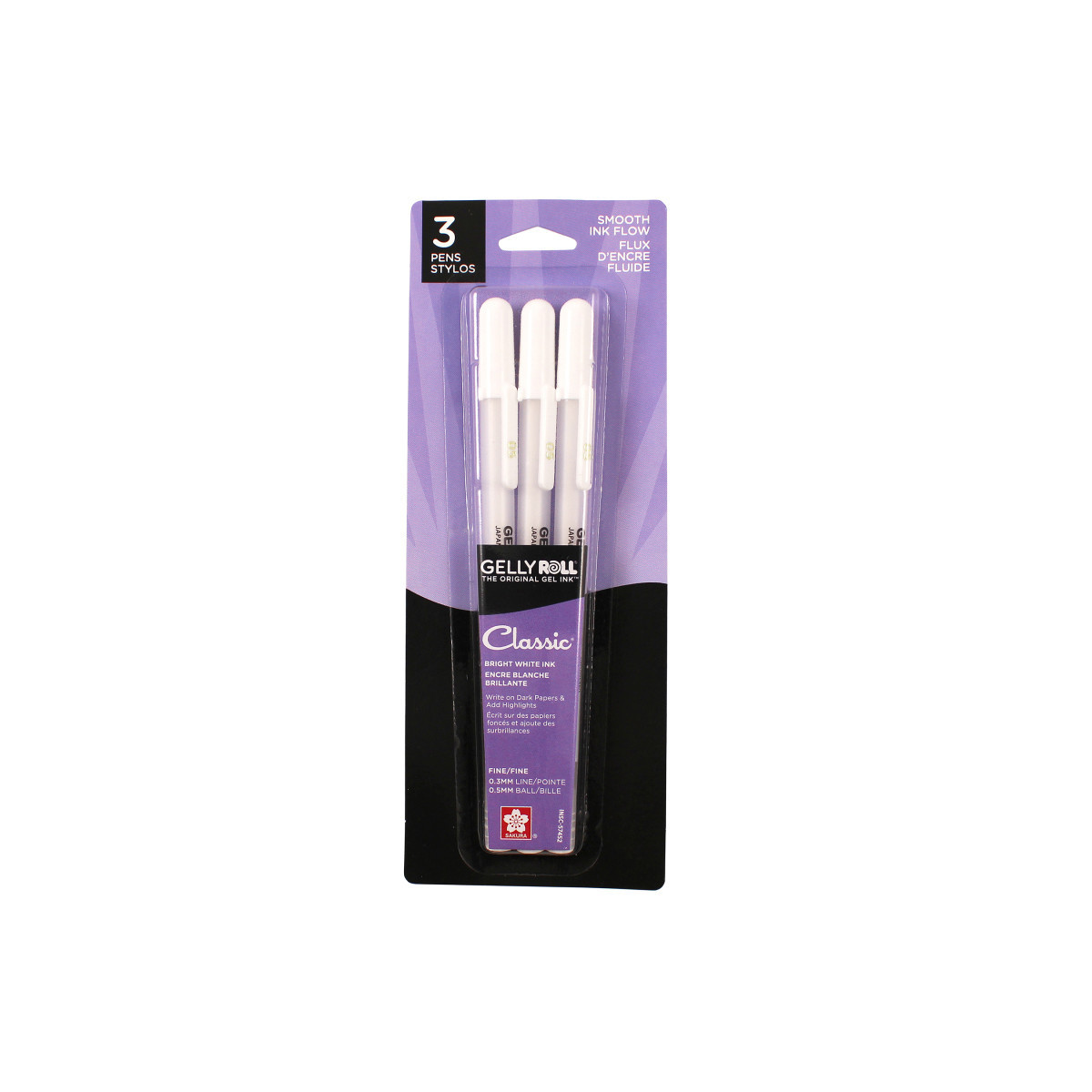 Sakura has perfected the smooth ink flow technology of Gelly roll classic White. The opaque White ink stands out on dark and colored papers and makes highlights pop in illustrations and Comics. Use it for hand lettering, accents party crafts, layered on top of colors for mixed media and bright highlights in tonal drawings. Elevate your writing and drawing to another level using the range of thick and thin lines, small detail and unique bold marks. Each pack contains 3 Gelly roll White classic .05 (fine point) pens.