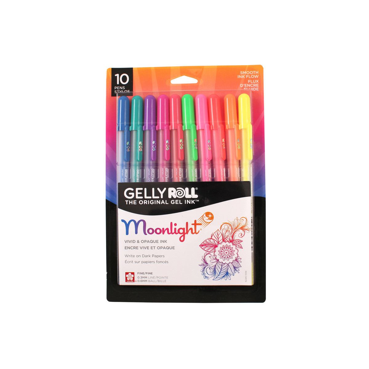 In the 1980s, Sakura surprised the pen industry with the invention of the first gel-based ink creating the first and original gel pen. The unique paint-like quality and performance of Moonlight is ideal for both white and dark papers. The Ice Cream Smooth™, opaque ink is perfect for writing in journals, decorating cards, pattern drawing, or detailed accents. The fine line 06 nib allows for the ink to dry with very little wait time, minimizing the risk of smearing. All colors are bright on white paper and produce outstanding effects on quality black paper. Each pack includes 1 each of Fl. Yellow, Fl. Orange, Fl. Vermilion, Fl. Pink, Fl. Green, Red, Rose, Purple, Green, and Blue.