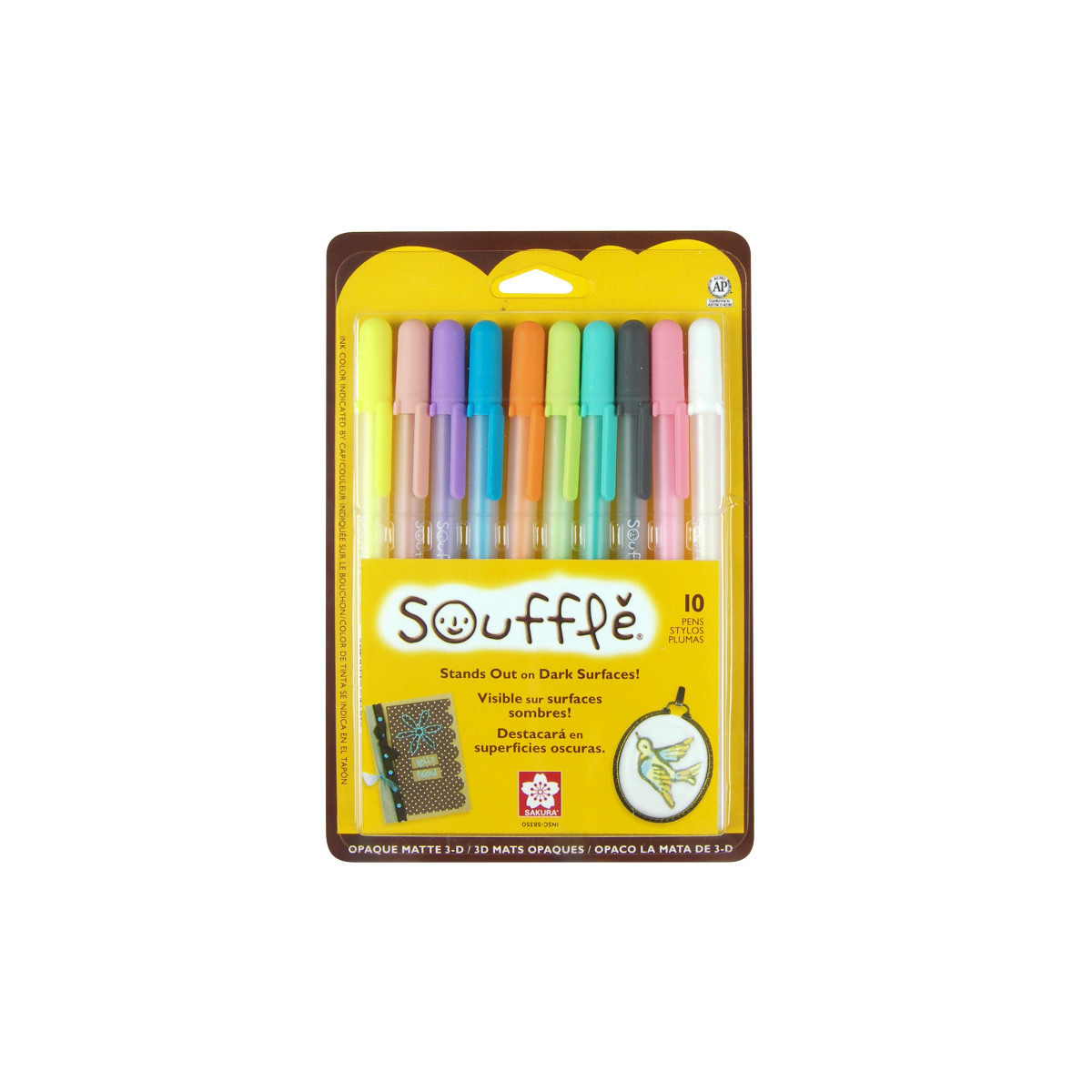 The soft color and raised line of Soufflé add dimension to DIY craft projects. Three dimensional (3-D) ink leaves a raised ink line for writing you can feel. Soufflé pens color on plastic, coated paper, acetate, vellum and glass. One-of-a-kind, 3-D Soufflé ink comes in soft pastels and white, all of which dramatically stand out on dark backgrounds. No need to shake, pump or squeeze – just write slowly to let ample ink flow from the tip and allow time to dry completely.