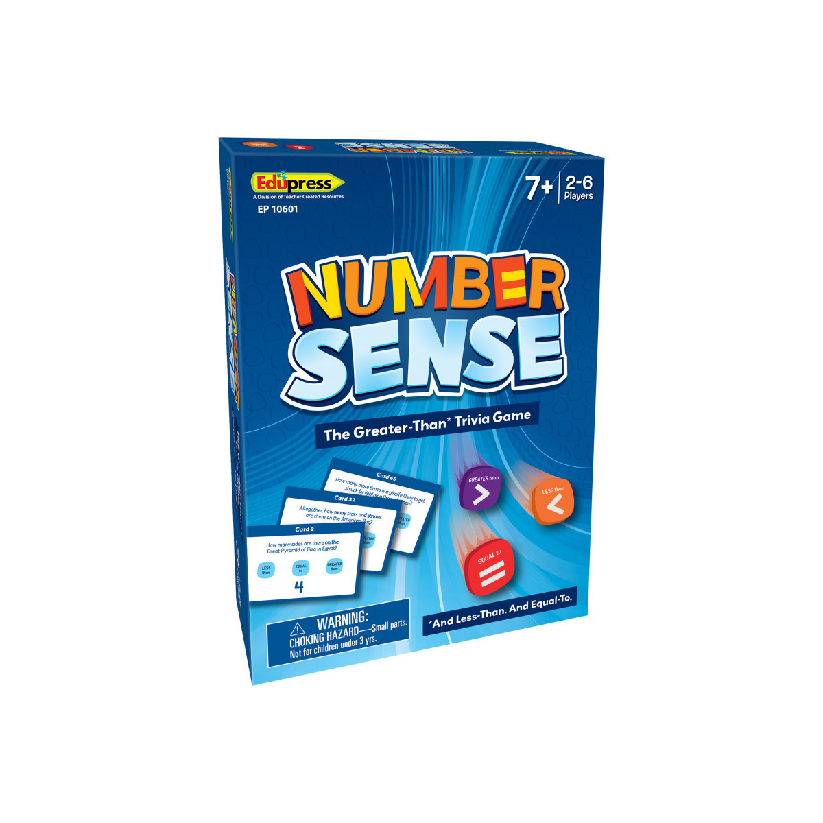 Number Sense is a trivia game that gives all the answers—but not all the answers are correct! Each trivia question is a fascinating fact with a numerical answer; and it's up to players to decide if that number is too high, too low, or just right. Each player's number sense will be tested as they earn (or lose) points based on how sure they are that they know the right answer. Includes 80 trivia cards (3" x 4-1/2"), 6 player boards (5" x 7"), 48 foam game pieces (approx. 1-1/4" x 1-1/4"), and an instruction sheet.