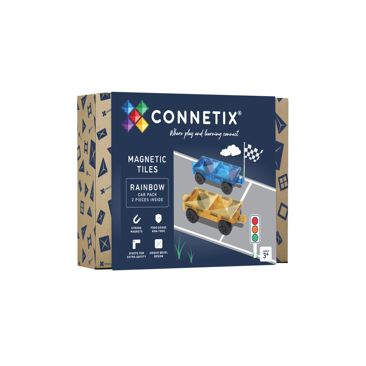 Compatible with the entire CONNETIX range, the Car Pack brings exciting new possibilities to magnetic tile play! Grow your collection and complement your CONNETIX 2 Piece Rainbow Car Pack with the CONNETIX 102 Piece Rainbow Creative Pack or the CONNETIX 60 Piece Rainbow Starter Pack to collect standard tiles of various shapes and create limitless vehicle creations.