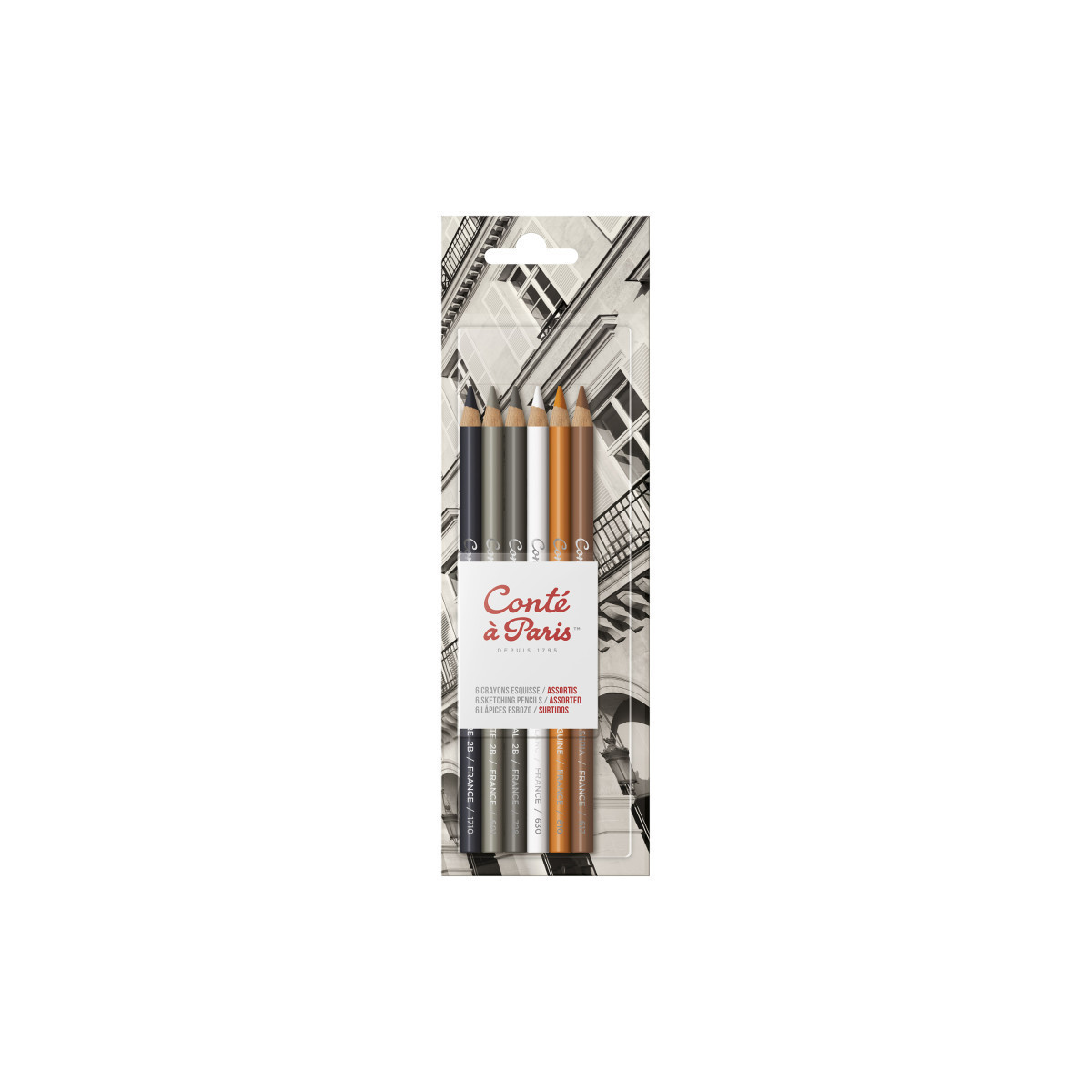 Renowned for their exceptional quality and ease of use, Conté à Paris Sketch Pencils guarantee the widest variety of drawing techniques and effects. They are ideal for realistic drawings, quick sketches, and light and shadow studies. The metal box ensures optimal organization and maximum protection of the tools, making them easy to carry for traveling artists. In addition, the wide range of hardnesses and types of pencils allows for great creative flexibility.. Versatile, these Sketch Pencils meet a wide variety of lines, tone, and intensity. This set contains the essentials for sketching: 1 Black Stone Pencil 2B, 2 Graphite Pencils 2B, 1 White Pencil, 1 Sanguine, and 1 Sepia.