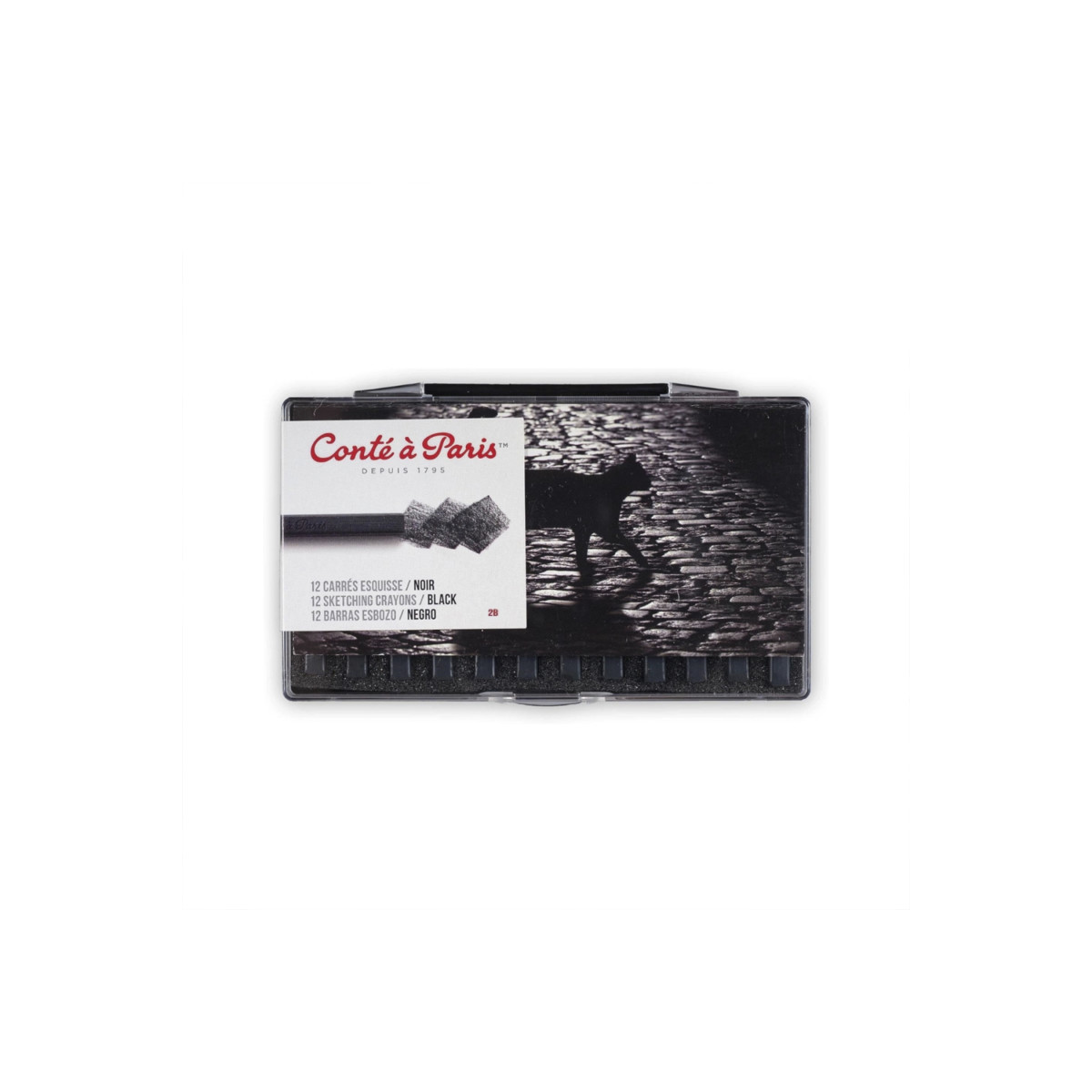 Explore expressive shadow and tone with Conté à Paris Carrés Esquisse Sketching Pastel Crayons, Black 2B, Set of 12. The softest grade in the Black series, these square sketching crayons glide smoothly across the surface to deliver deep, velvety blacks and rich gradients. Their buttery texture allows effortless blending, layering, and smudging for dynamic chiaroscuro effects. Ideal for life drawing, portrait studies, and dramatic tonal work, the 2B grade provides bold coverage without sacrificing control. Pair with White, Red, or Bistre Conté crayons to achieve a full tonal range. A favorite among artists and educators, Conté à Paris continues its heritage of precision and quality craftsmanship.