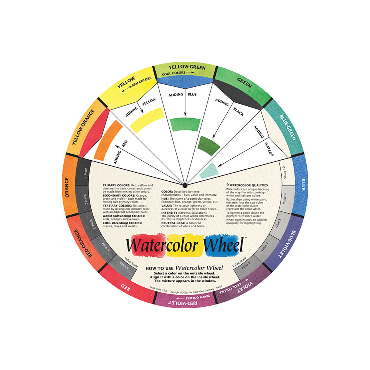 Master transparent color mixing with the Watercolor Wheel, 9-1/4" Diameter. Designed specifically for watercolor artists and students, this durable rotating chart visually demonstrates how pigments interact to create new hues and values. It clearly displays primary, secondary, and tertiary colors, along with tinting, shading, and tone relationships unique to watercolor painting. The easy-to-use format helps artists achieve balanced color harmony and consistent washes with confidence. Ideal for classrooms, studios, and workshops, the Watercolor Wheel simplifies color theory for both beginners and experienced painters. Compact yet comprehensive, it’s a valuable teaching and reference tool for developing skillful, expressive watercolor techniques in any creative setting.