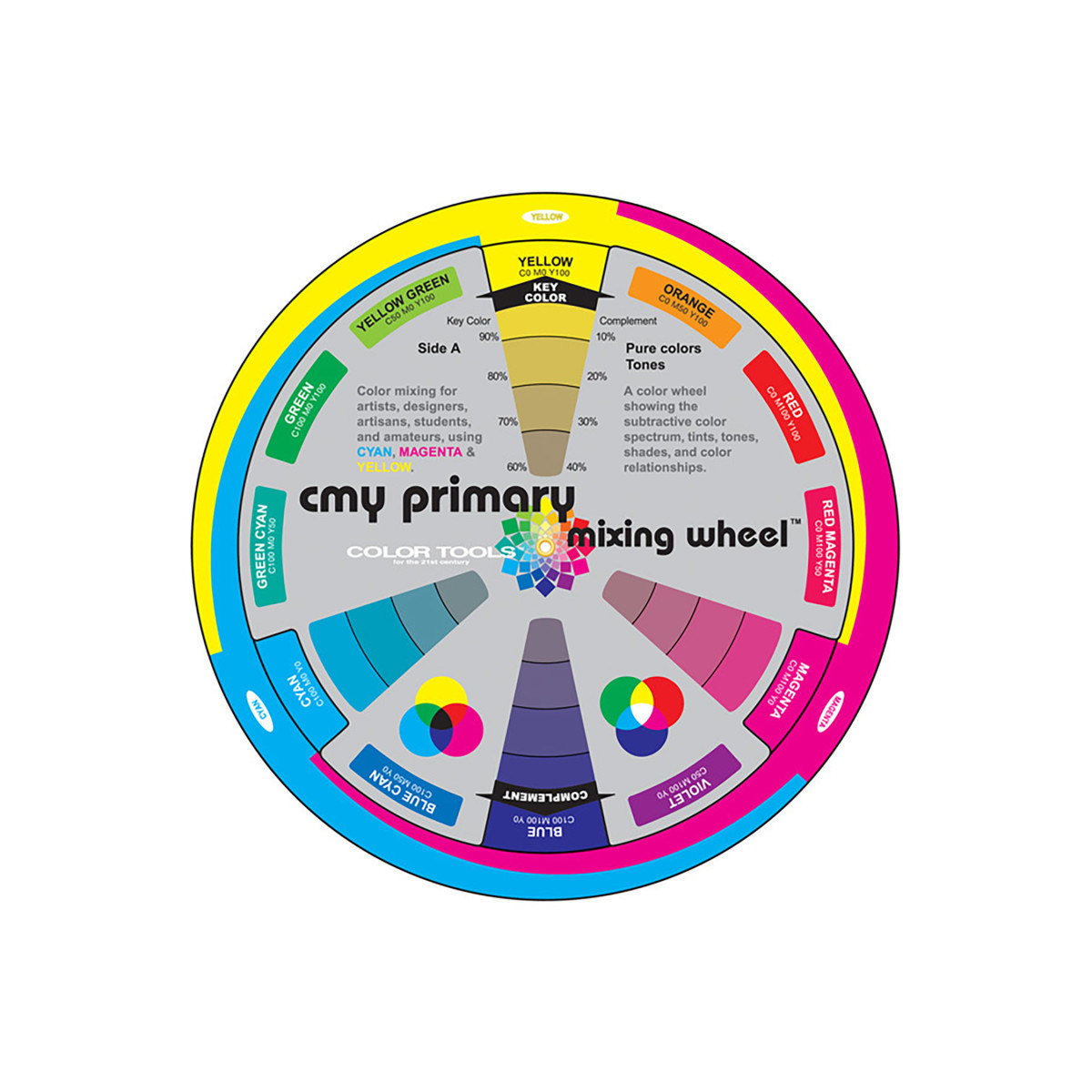 Enhance your understanding of modern color theory with the CMY Primary Color Wheel, 7-3/4" Diameter. This innovative reference tool illustrates how cyan, magenta, and yellow—the true subtractive primaries—combine to create the full spectrum of colors used in printing, painting, and design. The rotating wheel clearly displays secondary and tertiary hues, along with complementary and analogous relationships for accurate color harmony. Ideal for classrooms, studios, and graphic design applications, it helps users visualize pigment mixing and color balance with clarity. Compact yet durable, the CMY Primary Color Wheel bridges traditional and contemporary color systems, making it an essential educational resource for students, artists, and designers alike.