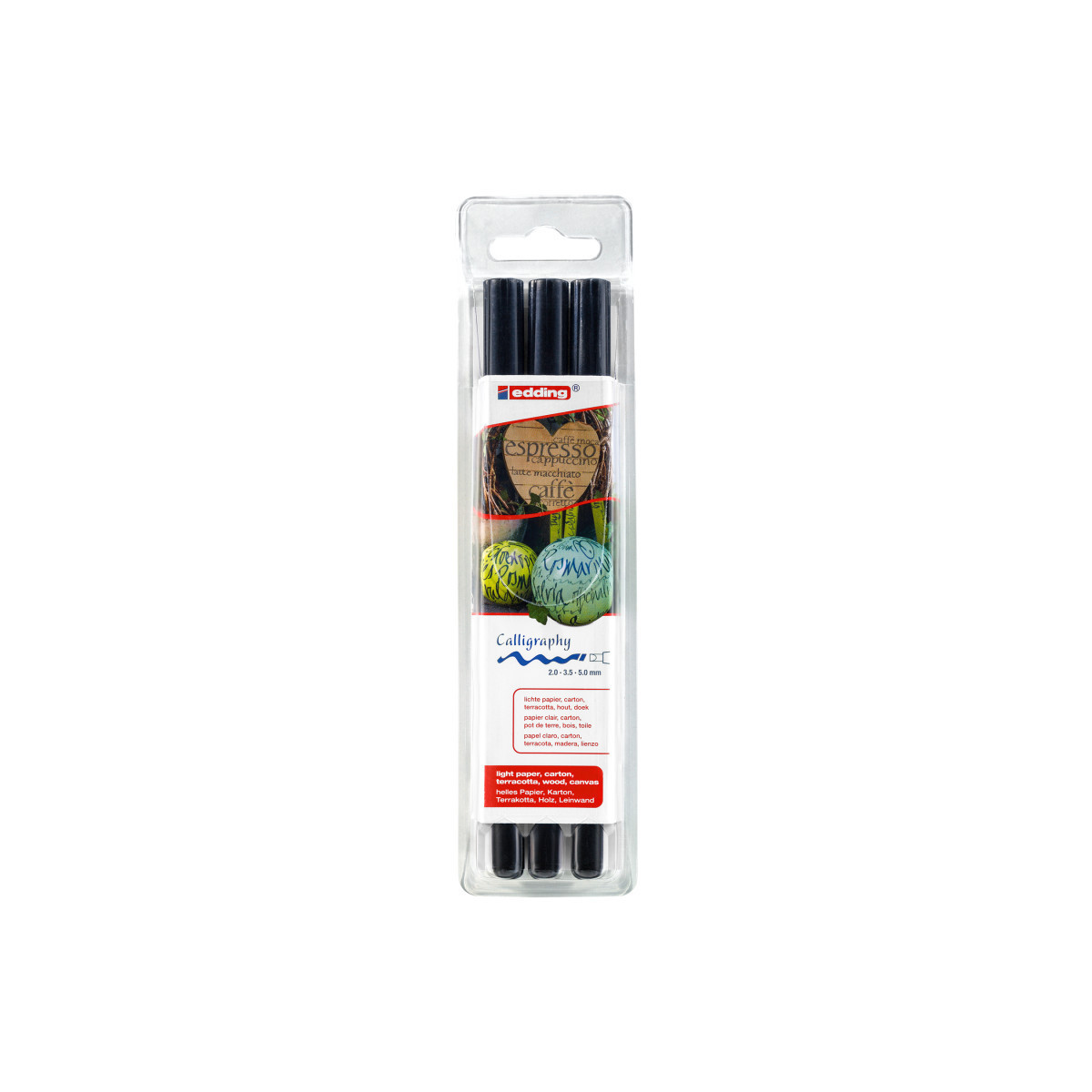 Create elegant lettering and expressive linework with edding 1255 Series Calligraphy Pens, Black, Set of 3. Designed for artists, students, and designers, these high-quality pens feature a flexible calligraphy tip that produces crisp, clean strokes with consistent ink flow. The set includes three nib widths—2 mm, 3.5 mm, and 5 mm—allowing for varied line thickness and precise control across writing styles and decorative designs. The quick-drying, water-based pigment ink delivers deep, fade-resistant color on paper and card stock without bleeding. Ideal for hand lettering, journaling, invitations, and illustration, edding calligraphy pens combine comfort, precision, and durability for professional-quality results every time.