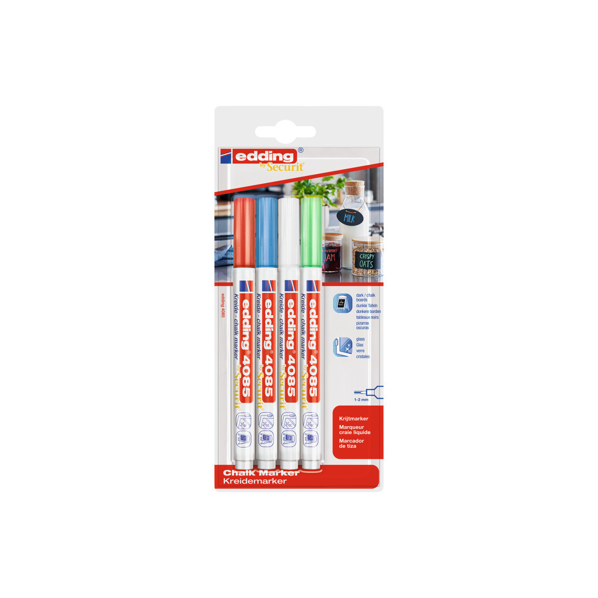 Create colorful, erasable designs with edding 4085 Series Chalk Markers, Assorted Colors, Set of 4. These high-quality liquid chalk markers are perfect for writing, drawing, and decorating on non-porous surfaces such as chalkboards, glass, windows, mirrors, and metal. The water-based ink delivers vibrant, opaque color that dries quickly, resists smudging, and wipes away easily with a damp cloth. Each marker features a fine bullet tip for clean, precise lines ideal for lettering, signage, and illustration. The set includes four bold, assorted colors for versatile use in classrooms, cafés, offices, and studios. With smooth ink flow and brilliant coverage, edding 4085 Series markers offer professional performance and easy cleanup for creative expression anywhere.