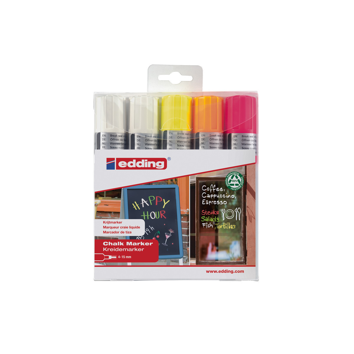 Make bold, colorful statements with edding 4090 Series Chalk Markers, Neon Colors, Set of 5. Featuring a large chisel tip, these premium liquid chalk markers create vibrant, opaque lines perfect for signage, menus, displays, and artwork on non-porous surfaces such as glass, mirrors, and chalkboards. The water-based ink provides brilliant coverage that’s smudge-resistant when dry yet wipes away easily with a damp cloth. Ideal for classrooms, cafés, and creative studios, the set includes five assorted neon colors for eye-catching presentations and decorative designs. Offering smooth, consistent ink flow and excellent color intensity, edding 4090 Series markers combine professional performance, easy cleanup, and environmentally friendly, low-odor ink for everyday creative use.