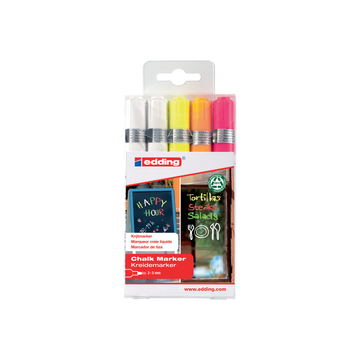 Create colorful, clean, and erasable designs with edding 4095 Series Chalk Markers, Assorted Colors, Set of 5. These premium-quality liquid chalk markers produce bright, opaque color on non-porous surfaces such as chalkboards, glass, mirrors, and metal. The fine bullet tip allows for detailed writing, outlining, and drawing with smooth, consistent ink flow. Water-based and low-odor, the ink dries quickly, is smudge-resistant when dry, and wipes away easily with a damp cloth for simple reuse. Ideal for classrooms, cafés, and creative studios, this set includes five vibrant colors perfect for decorative lettering and signage. edding 4095 Series markers deliver precise control, excellent coverage, and easy cleanup for both professional and everyday creative use.