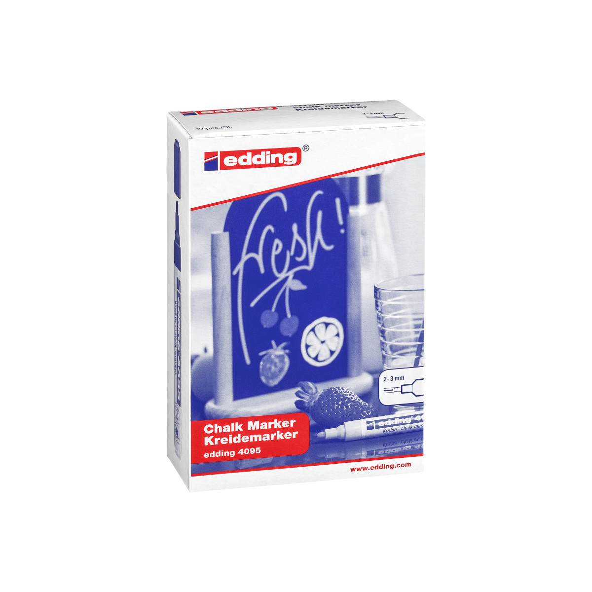 Create colorful, clean, and erasable designs with edding 4095 Series Chalk Markers, Assorted Colors, Set of 10. These premium-quality liquid chalk markers produce bright, opaque color on non-porous surfaces such as chalkboards, glass, mirrors, and metal. The fine bullet tip allows for detailed writing, outlining, and drawing with smooth, consistent ink flow. Water-based and low-odor, the ink dries quickly, is smudge-resistant when dry, and wipes away easily with a damp cloth for simple reuse. Ideal for classrooms, cafés, and creative studios, this set includes ten vibrant colors perfect for decorative lettering and signage. edding 4095 Series markers deliver precise control, excellent coverage, and easy cleanup for both professional and everyday creative use.