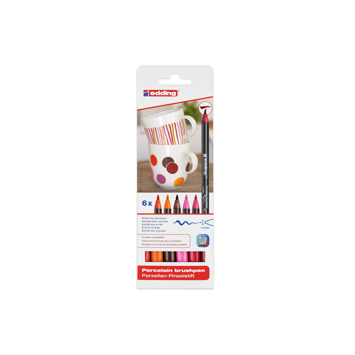 Bring warmth and vibrancy to your ceramic and glass creations with edding 4200 Series Porcelain Brush Pens, Warm Colors, Set of 6. These high-quality brush pens feature flexible fiber tips that make it easy to create fine details, bold strokes, and smooth fills. The water-based pigment ink offers rich, opaque coverage on glazed ceramics, porcelain, and glass, and becomes dishwasher-safe after heat fixing in a conventional oven. The warm color palette includes reds, yellows, and complementary tones ideal for cheerful, inviting designs. Low-odor and easy to use, these pens are perfect for classrooms, craft studios, and home DIY projects. edding 4200 Series pens combine professional-quality results with effortless creative freedom.
