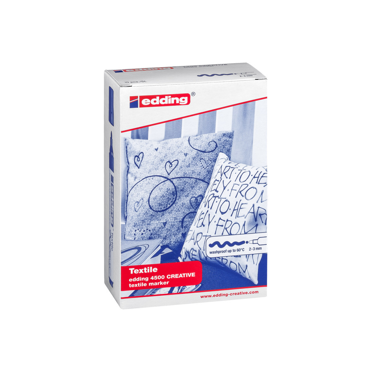 Design and personalize your own fabrics with edding 4500 Series Textile Markers, Trendy Colors, Set of 10. These premium fabric markers feature fine bullet tips for precise, smooth lines, perfect for decorating cotton, linen, and most light-colored fabrics. The water-based pigment ink delivers vibrant, permanent color once heat-set with an iron, remaining washable up to 140°F (60°C). This stylish set of 10 includes modern, fashion-inspired tones ideal for custom T-shirts, tote bags, and home décor projects. Low-odor and easy to use, these markers make textile art fun for students, crafters, and professionals alike. edding 4500 Series textile markers combine vivid color, long-lasting durability, and effortless creativity for every fabric design project.