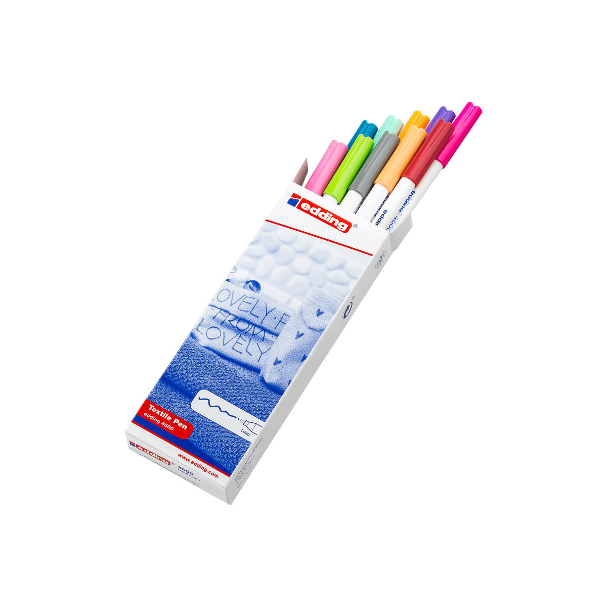 Bring your fabric designs to life with edding 4600 Series Textile Pens, Fun Colors, Box of 10. These premium fabric pens feature fine fiber tips for smooth, detailed drawing, writing, and outlining on cotton, linen, and most untreated light fabrics. The water-based pigment ink glides effortlessly and becomes permanent after heat fixing with an iron, staying vibrant through washes up to 140 °F (60 °C). The cheerful, fun color selection is perfect for personalizing T-shirts, tote bags, and creative textile projects. Low-odor and easy to use, these pens are ideal for students, teachers, and crafters. edding 4600 Series textile pens combine brilliant, long-lasting color with precision control for professional-quality results on every fabric surface.