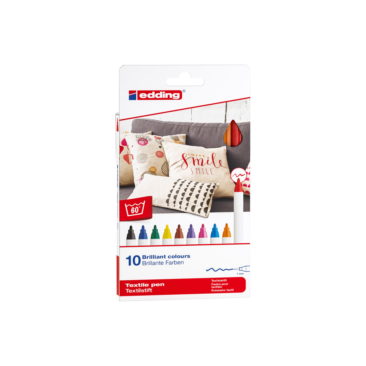 Personalize your fabrics with edding 4600 Series Textile Pens, Basic Colors, Set of 5. These high-quality fiber-tip pens are designed for smooth, controlled application on cotton, linen, and most untreated light fabrics. The water-based pigment ink produces rich, even color that becomes permanent after heat fixing with an iron, remaining bright and wash-resistant up to 140 °F (60 °C). The fine tip allows for precision in outlining, writing, and detailed illustration, making these pens perfect for classrooms, studios, and craft projects. This essential 10-color set includes all the classic hues for everyday textile art. edding 4600 Series textile pens combine professional-grade performance with long-lasting color for creative customization that endures.